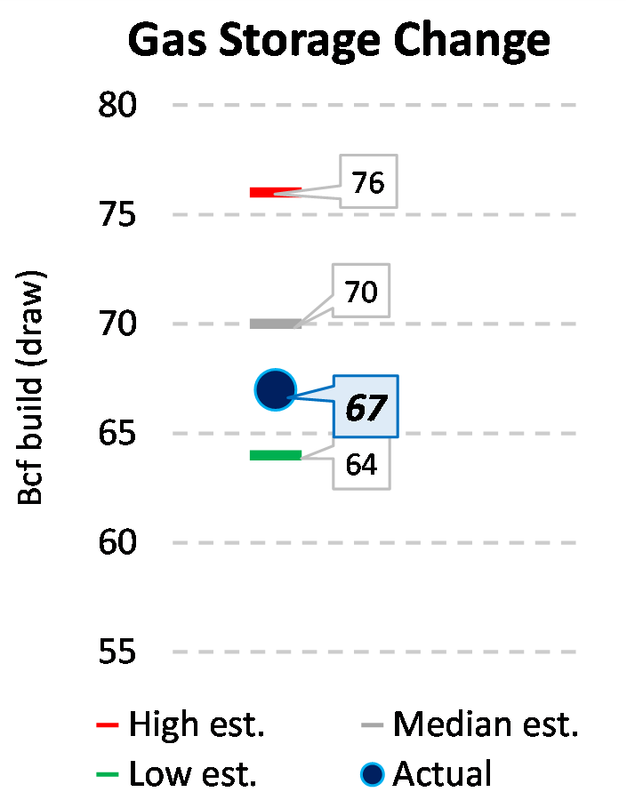 EIA reported a build of 67 Bcf for the week ending 6/11/2021. This was smaller than the median estimate of 70 Bcf. Today's stat fell within the expected range, which was 76 Bcf on the more bearish end, and 64 Bcf on the more bullish end.