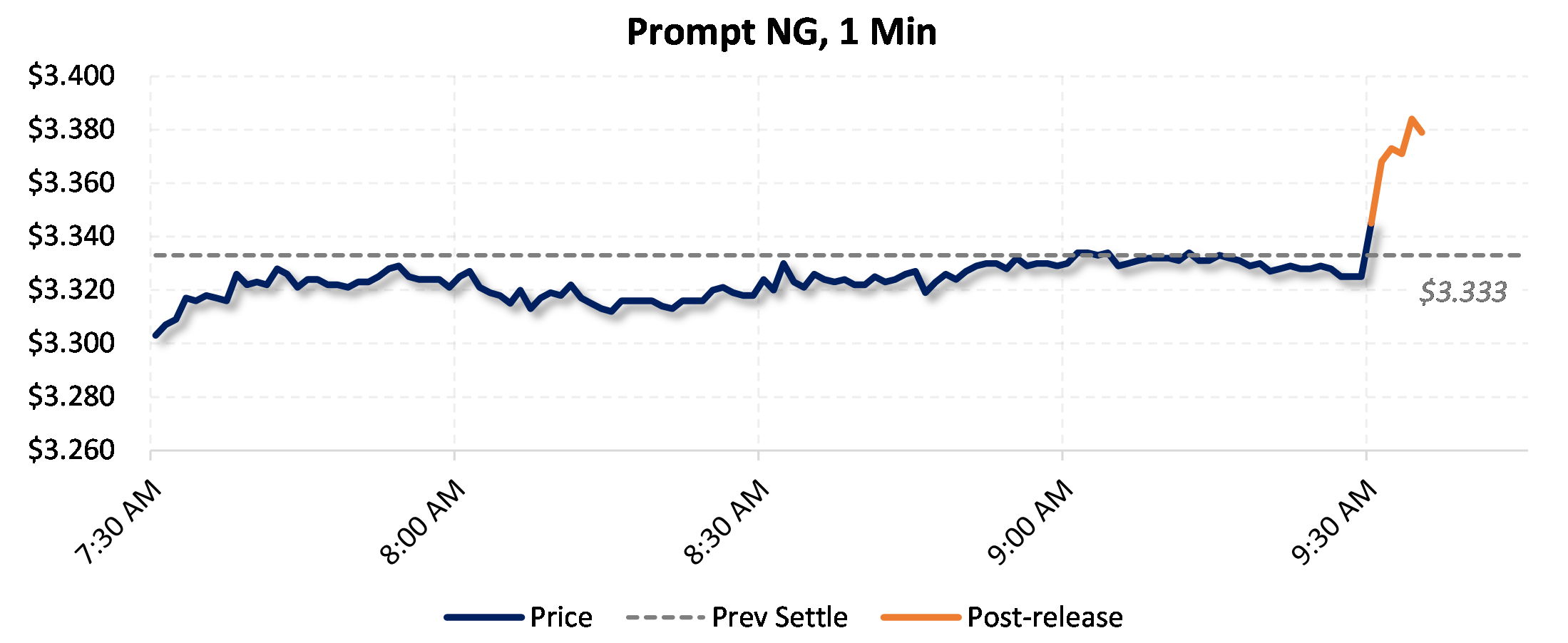 Prices were up in the five minutes following the announcement, to $3.371, from $3.325 just before 9:30am.