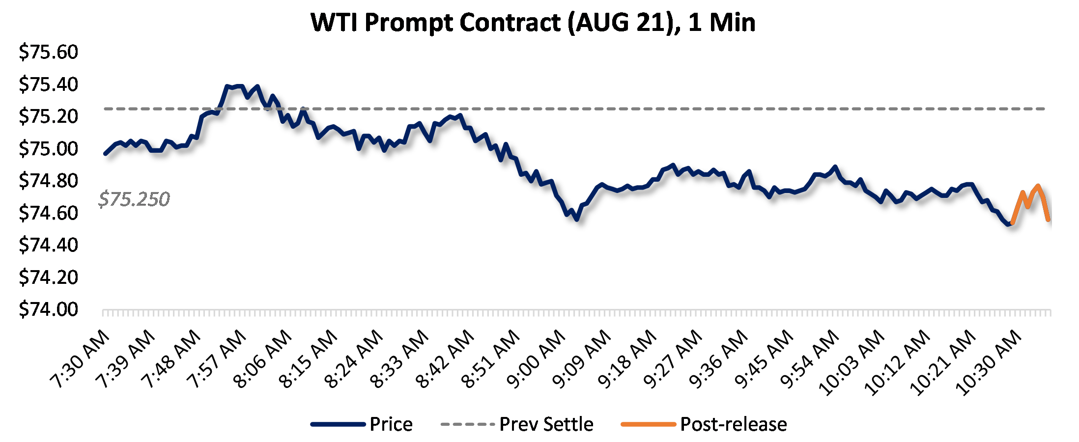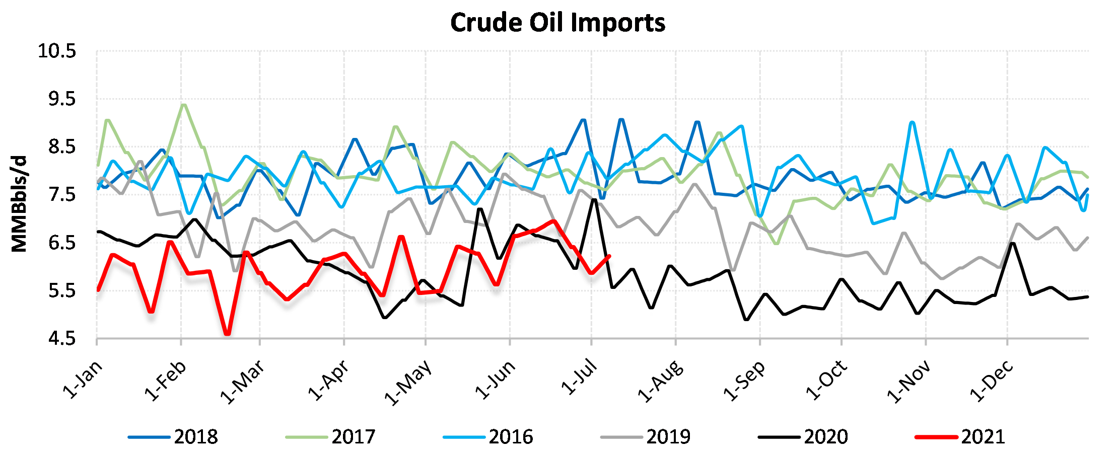 EIA reported a draw of -7896 MBbls in U.S. crude-oil inventories for the week ending 7/9/2021. This was larger than the average estimate of -4357 MBbls as reported by Bloomberg.