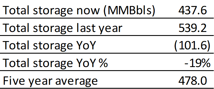 Inventories for the US are now at a deficit of 101.601 MBbls to last year and a deficit of 40.41 MBbls to the five-year average.