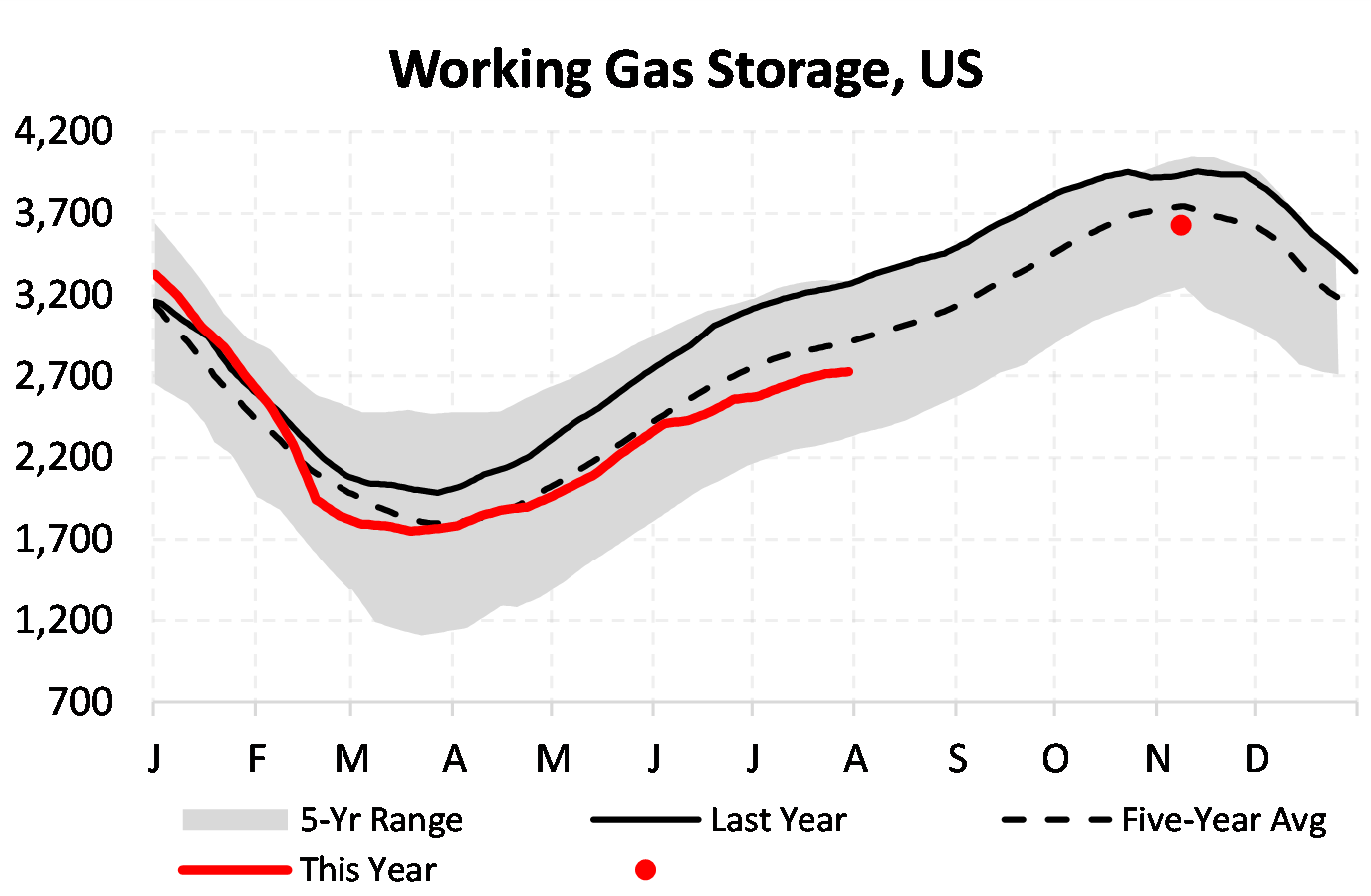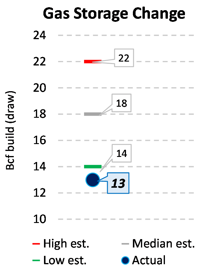 EIA reported a build of 13 Bcf for the week ending 7/30/2021. This was smaller than the median estimate of 18 Bcf. Today's stat fell outside the expected range, which was 22 Bcf on the more bearish end, and 14 Bcf on the more bullish end.