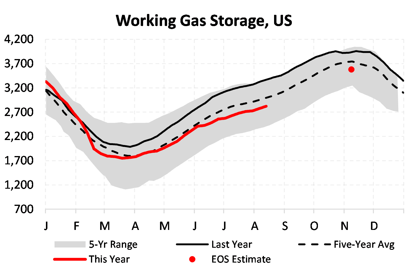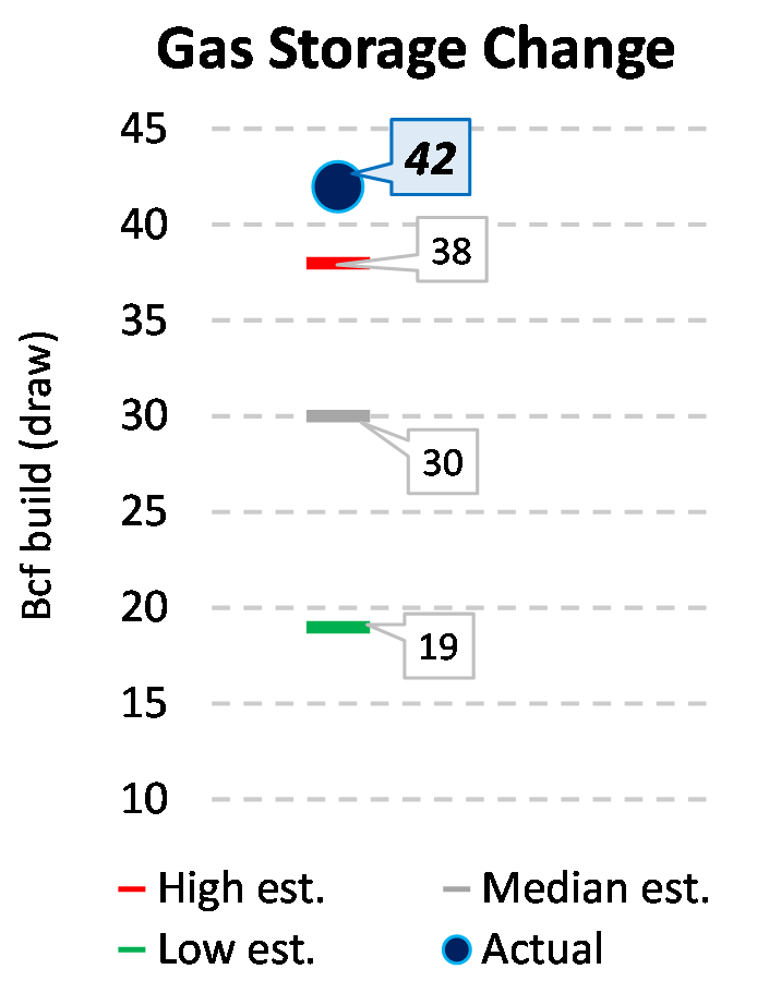 EIA reported a build of 42 Bcf for the week ending 8/13/2021. This was larger than the median estimate of 30 Bcf. Today's stat fell outside the expected range, which was 38 Bcf on the more bearish end, and 19 Bcf on the more bullish end.