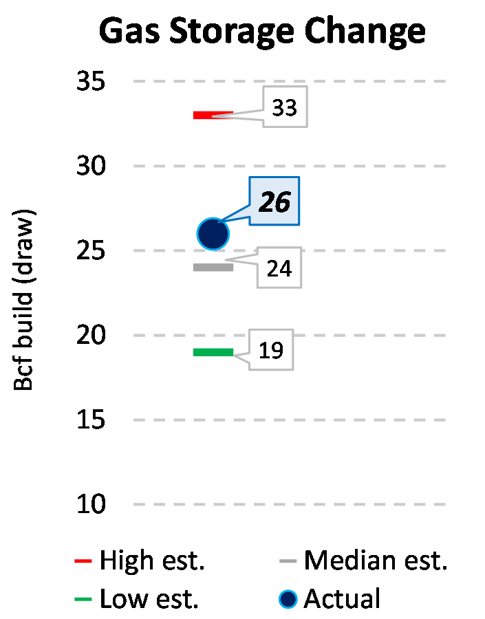 EIA reported a build of 26 Bcf for the week ending 11/12/2021. This was larger than the median estimate of 24 Bcf. Today's stat fell within the expected range, which was 33 Bcf on the more bearish end, and 19 Bcf on the more bullish end.