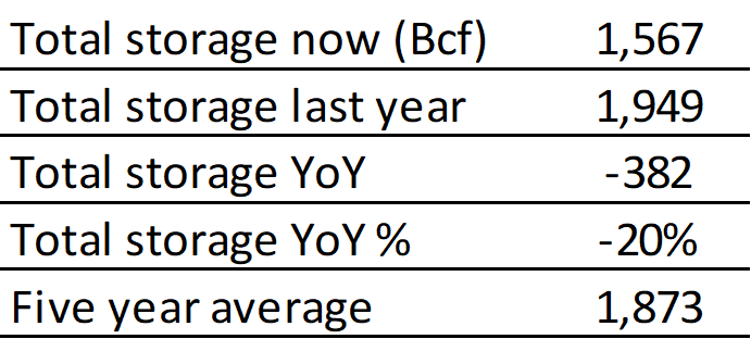 EIA reported a build of 77 Bcf for the week ending 4/29/2022. This was larger than the median estimate of 67.25 Bcf. Today's stat fell within the expected range, which was 81 Bcf on the more bearish end, and 41 Bcf on the more bullish end.