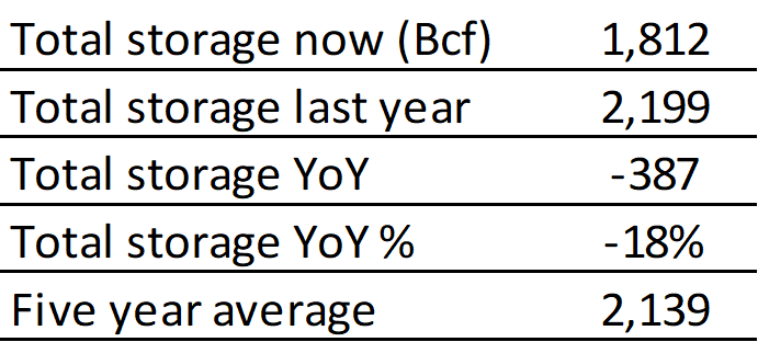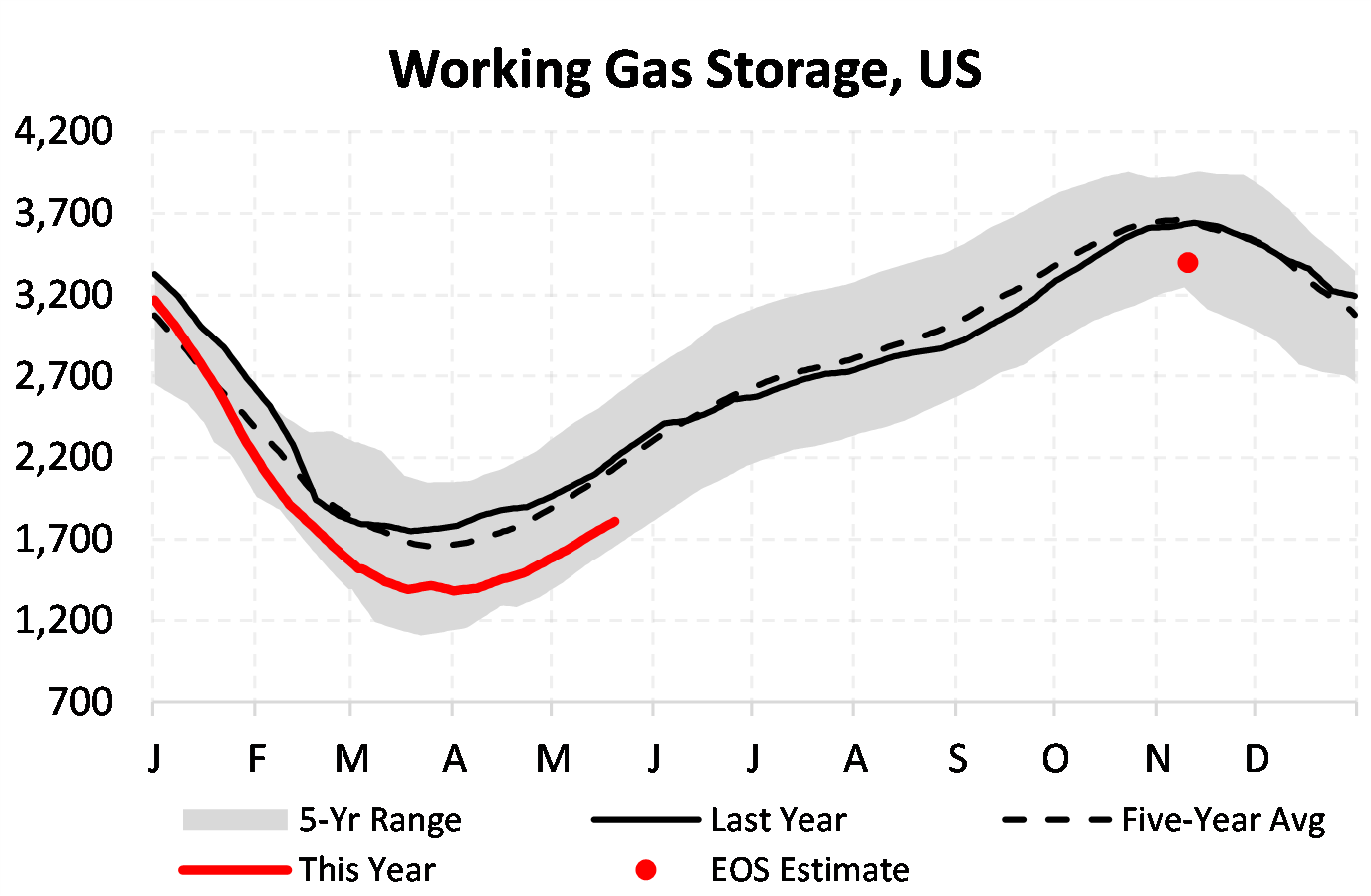 EIA reported a build of 80 Bcf for the week ending 5/20/2022. This was smaller than the median estimate of 88 Bcf. Today's stat fell within the expected range, which was 103 Bcf on the more bearish end, and 77 Bcf on the more bullish end.