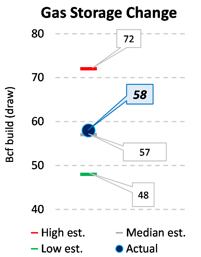 EIA reported a build of 58 Bcf for the week ending 7/08/2022. This was larger than the median estimate of 57 Bcf. Today's stat fell within the expected range, which was 72 Bcf on the more bearish end, and 48 Bcf on the more bullish end.