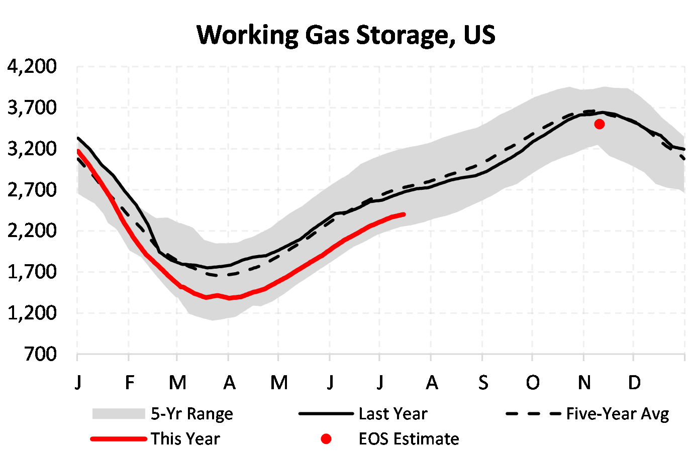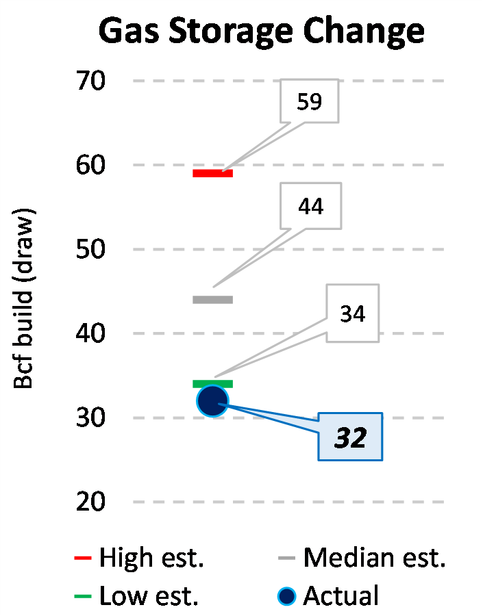 EIA reported a build of 32 Bcf for the week ending 7/15/2022. This was smaller than the median estimate of 44 Bcf. Today's stat fell outside the expected range, which was 59 Bcf on the more bearish end, and 34 Bcf on the more bullish end.