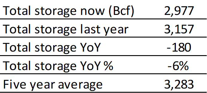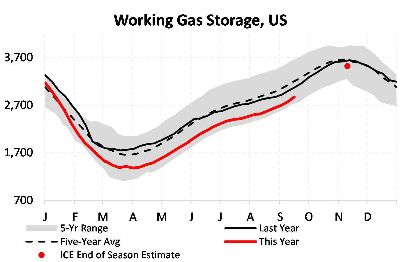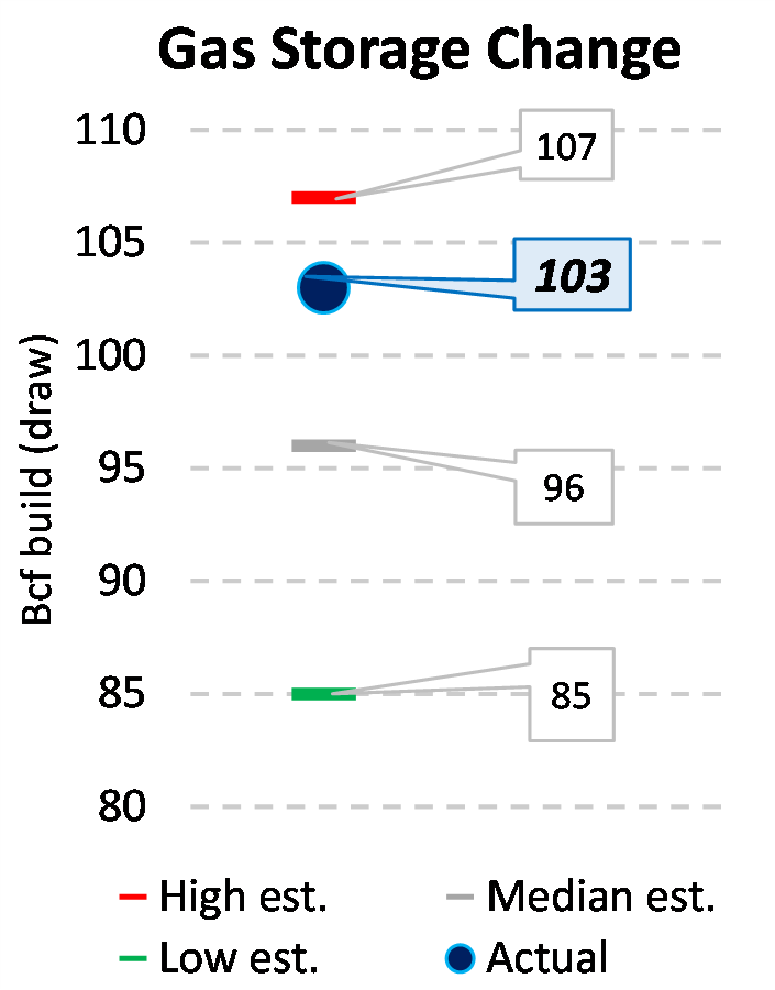 EIA reported a build of 103 Bcf for the week ending 9/23/2022. This was larger than the median estimate of 96 Bcf. Today's stat fell within the expected range, which was 107 Bcf on the more bearish end, and 85 Bcf on the more bullish end.
