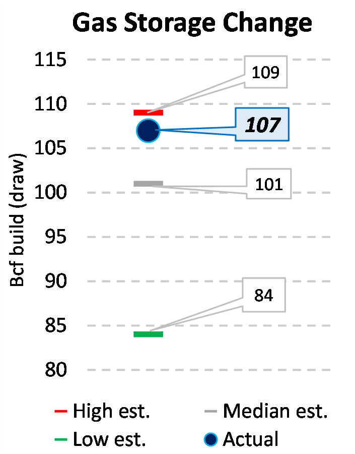 EIA reported a build of 107 Bcf for the week ending 10/28/2022. This was larger than the median estimate of 101 Bcf. Today's stat fell within the expected range, which was 109 Bcf on the more bearish end, and 84 Bcf on the more bullish end.