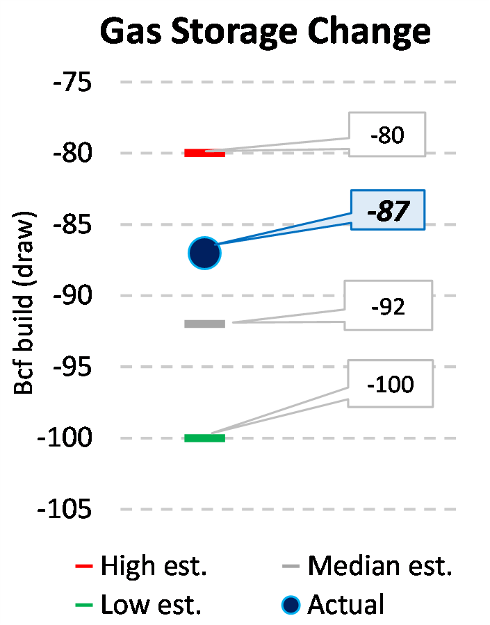 EIA reported a draw of -87 Bcf for the week ending 12/16/2022. This was smaller than the median estimate of -92 Bcf. Today's stat fell within the expected range, which was -80 Bcf on the more bearish end, and -100 Bcf on the more bullish end.