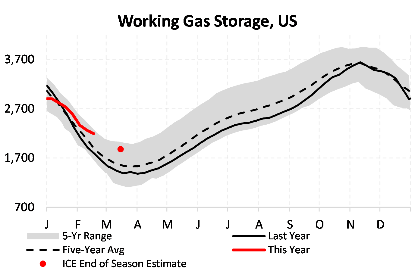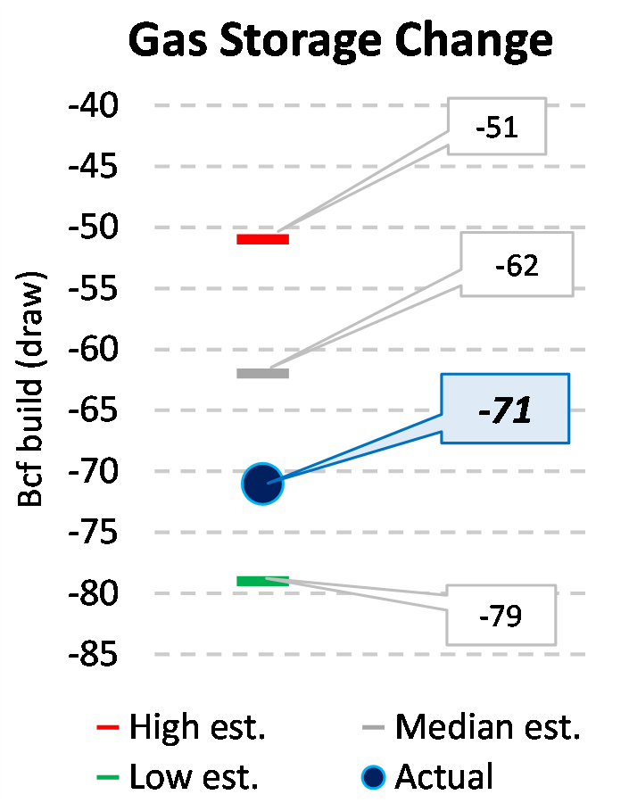 EIA reported a draw of -71 Bcf for the week ending 2/17/2023. This was larger than the median estimate of -62 Bcf. Today's stat fell within the expected range, which was -51 Bcf on the more bearish end, and -79 Bcf on the more bullish end.