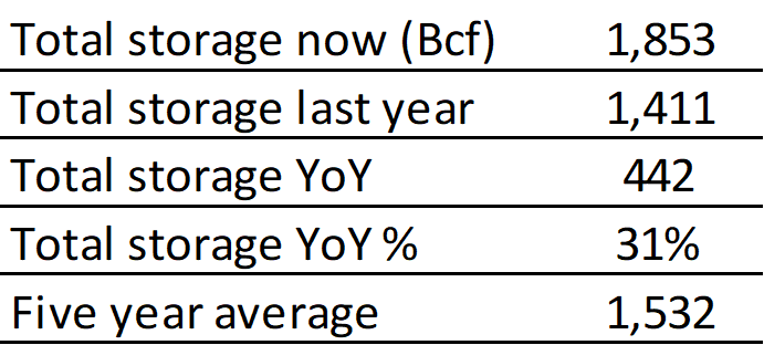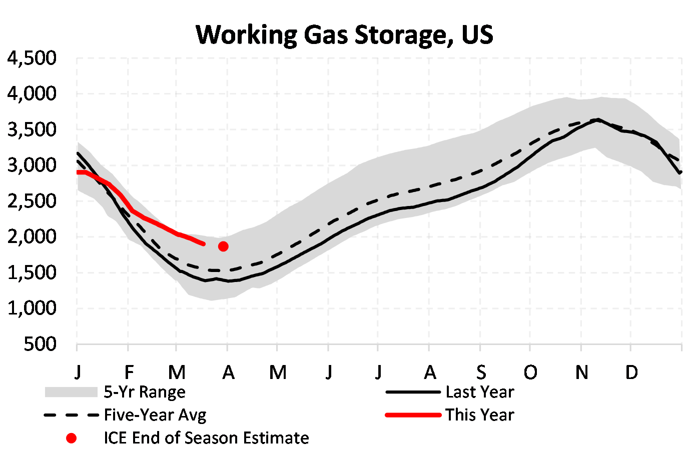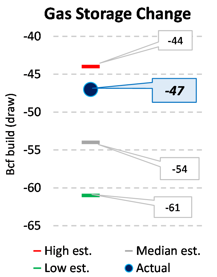EIA reported a draw of -47 Bcf for the week ending 3/24/2023. This was smaller than the median estimate of -54 Bcf. Today's stat fell within the expected range, which was -44 Bcf on the more bearish end, and -61 Bcf on the more bullish end.