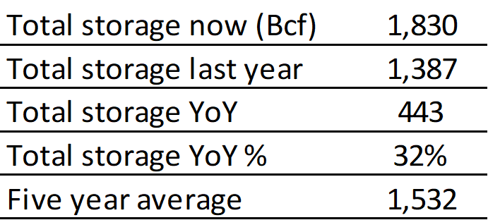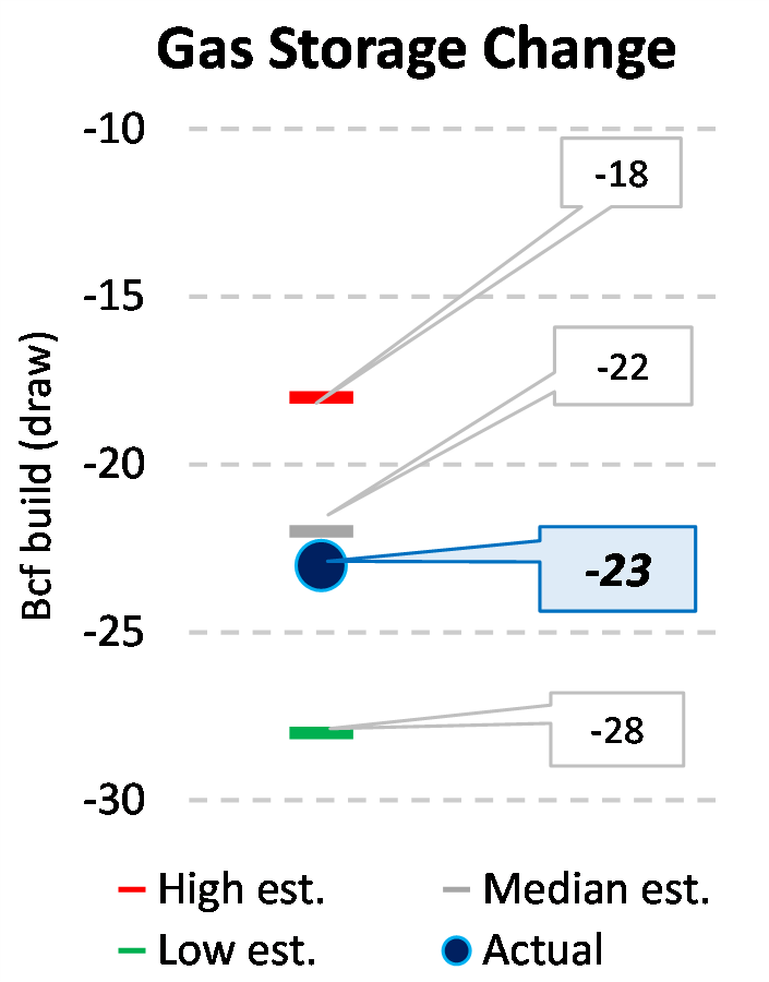 EIA reported a draw of -23 Bcf for the week ending 3/31/2023. This was larger than the median estimate of -22 Bcf. Today's stat fell within the expected range, which was -18 Bcf on the more bearish end, and -28 Bcf on the more bullish end.