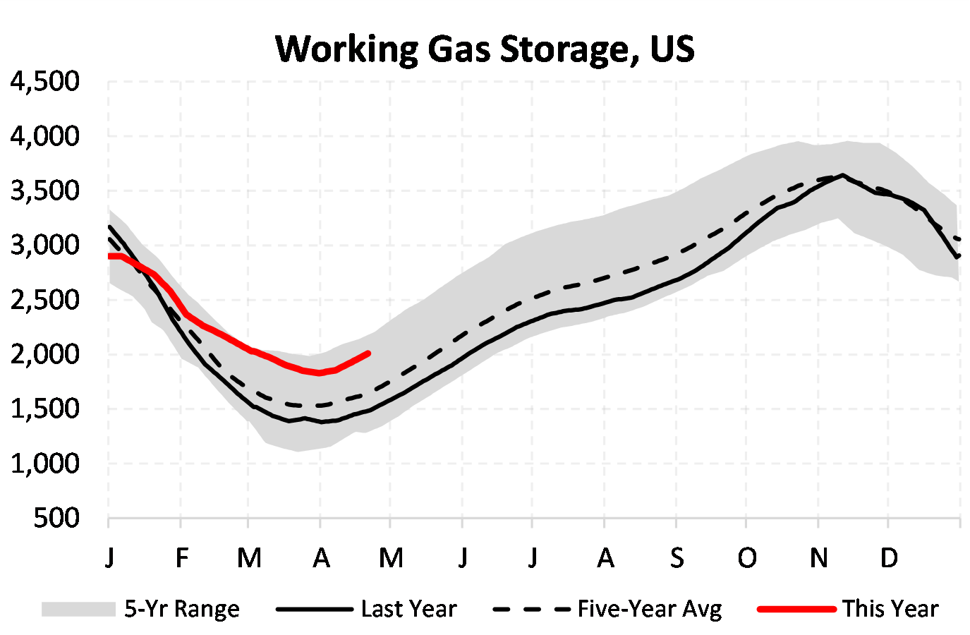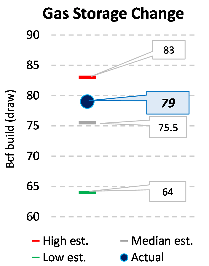 EIA reported a build of 79 Bcf for the week ending 4/21/2023. This was larger than the median estimate of 75.5 Bcf. Today's stat fell within the expected range, which was 83 Bcf on the more bearish end, and 64 Bcf on the more bullish end.