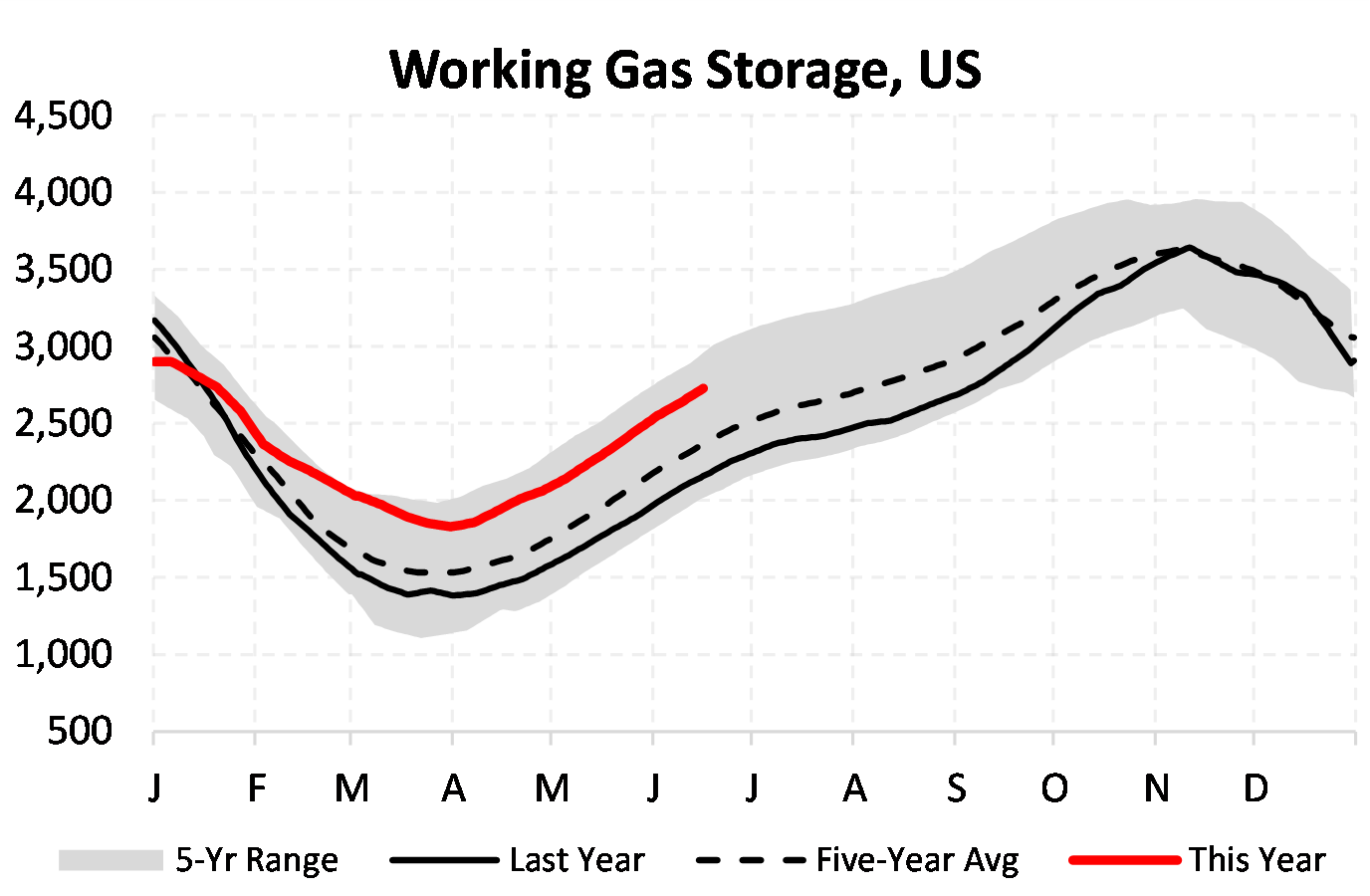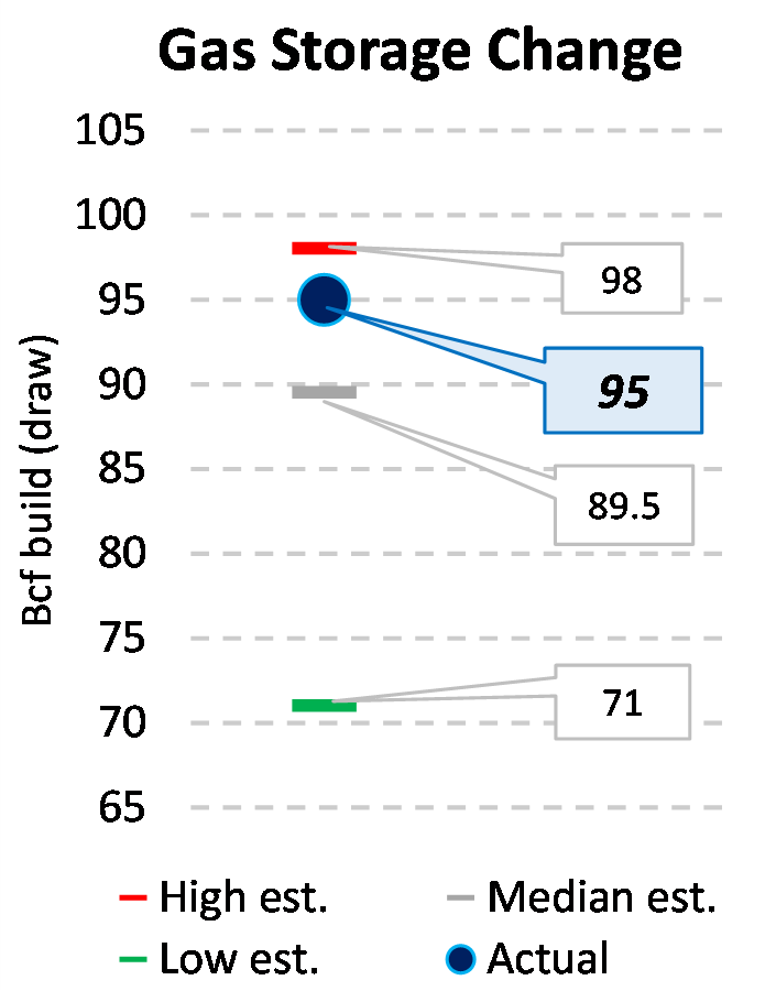 EIA reported a build of 95 Bcf for the week ending 6/16/2023. This was larger than the median estimate of 89.5 Bcf. Today's stat fell within the expected range, which was 98 Bcf on the more bearish end, and 71 Bcf on the more bullish end.