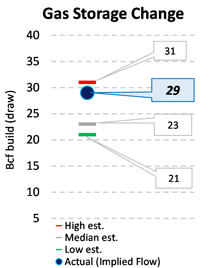 EIA reported a build of 29 Bcf for the week ending 8/04/2023. This was larger than the median estimate of 23 Bcf. Today's stat fell within the expected range, which was 31 Bcf on the more bearish end, and 21 Bcf on the more bullish end.