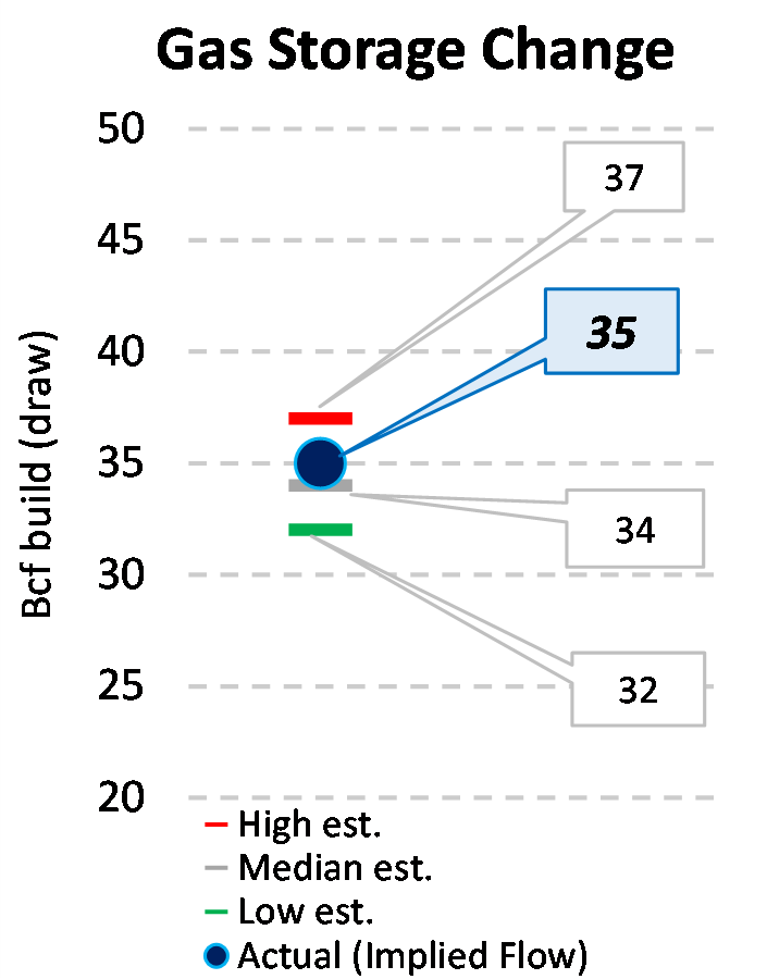 EIA reported a build of 35 Bcf for the week ending 8/11/2023. This was larger than the median estimate of 34 Bcf. Today's stat fell within the expected range, which was 37 Bcf on the more bearish end, and 32 Bcf on the more bullish end.