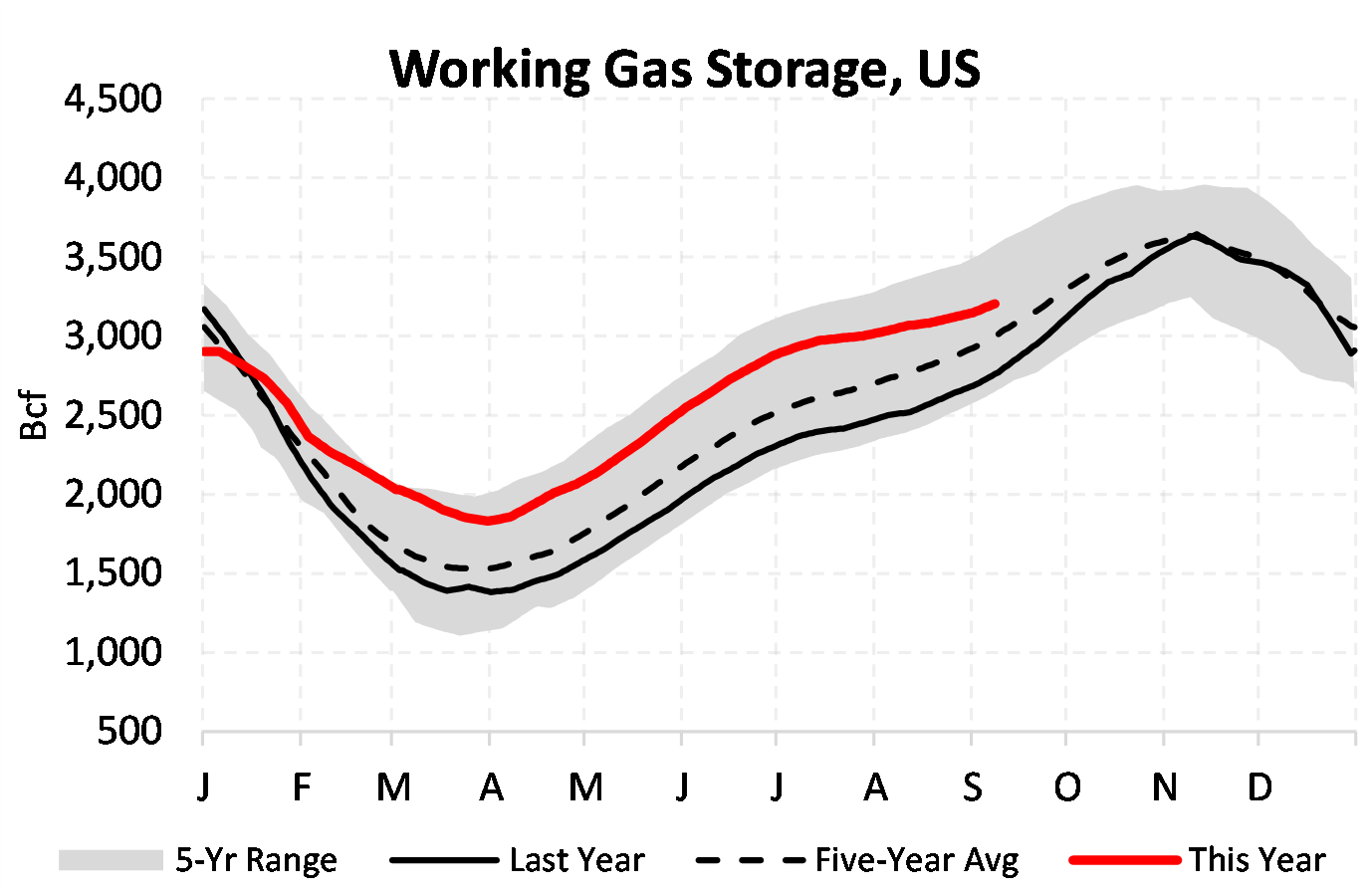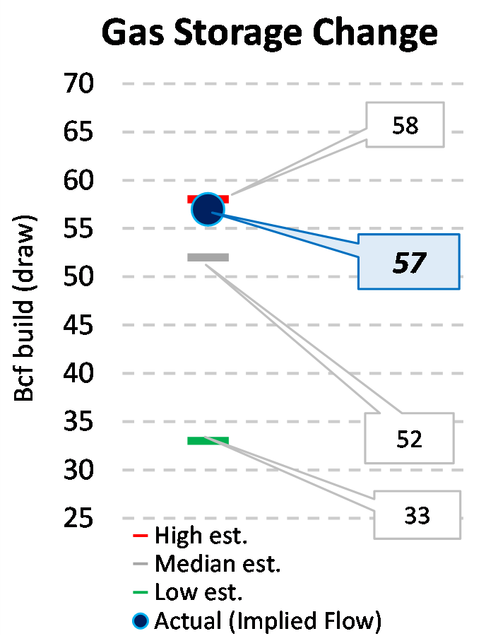 EIA reported a build of 57 Bcf for the week ending 9/08/2023. This was larger than the median estimate of 52 Bcf. Today's stat fell within the expected range, which was 58 Bcf on the more bearish end, and 33 Bcf on the more bullish end.