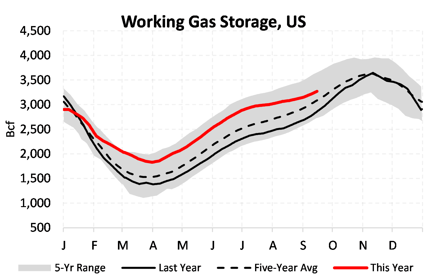 EIA reported a build of 64 Bcf for the week ending 9/15/2023. This was smaller than the median estimate of 65.5 Bcf. Today's stat fell within the expected range, which was 69 Bcf on the more bearish end, and 58 Bcf on the more bullish end.