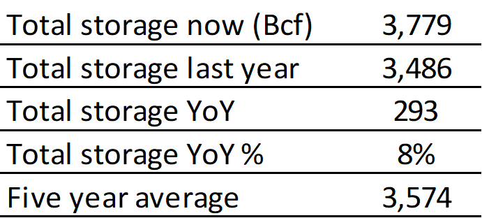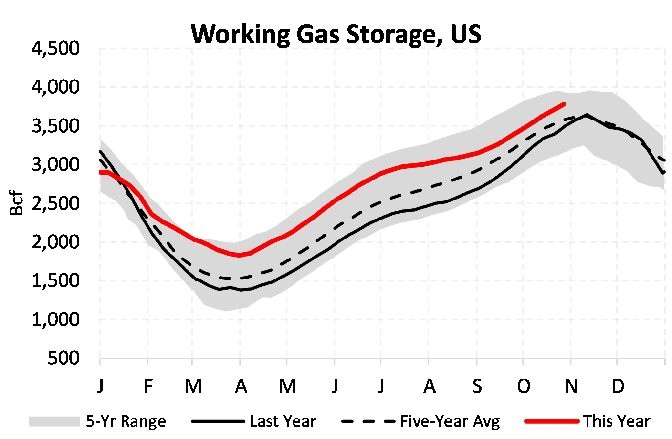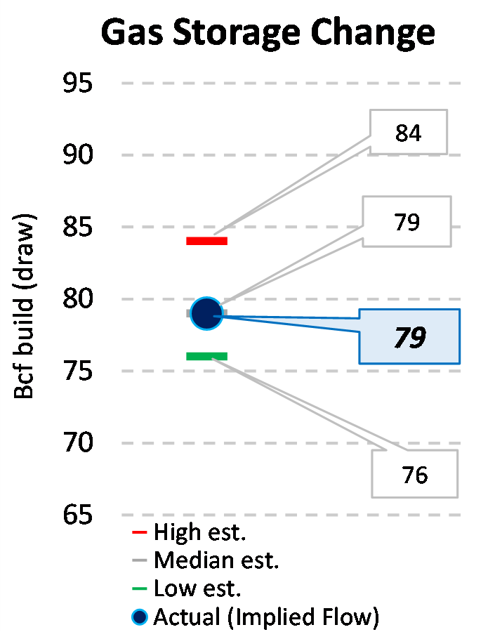 EIA reported a build of 79 Bcf for the week ending 10/27/2023. This was equal to the median estimate of 79 Bcf. Today's stat fell within the expected range, which was 84 Bcf on the more bearish end, and 76 Bcf on the more bullish end.