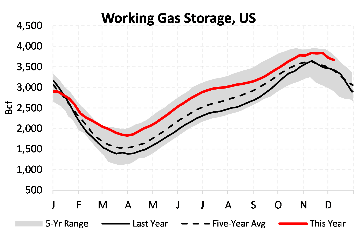 EIA reported a draw of -55 Bcf for the week ending 12/08/2023. This was smaller than the median estimate of -55.5 Bcf. Today's stat fell within the expected range, which was -48 Bcf on the more bearish end, and -63 Bcf on the more bullish end.
