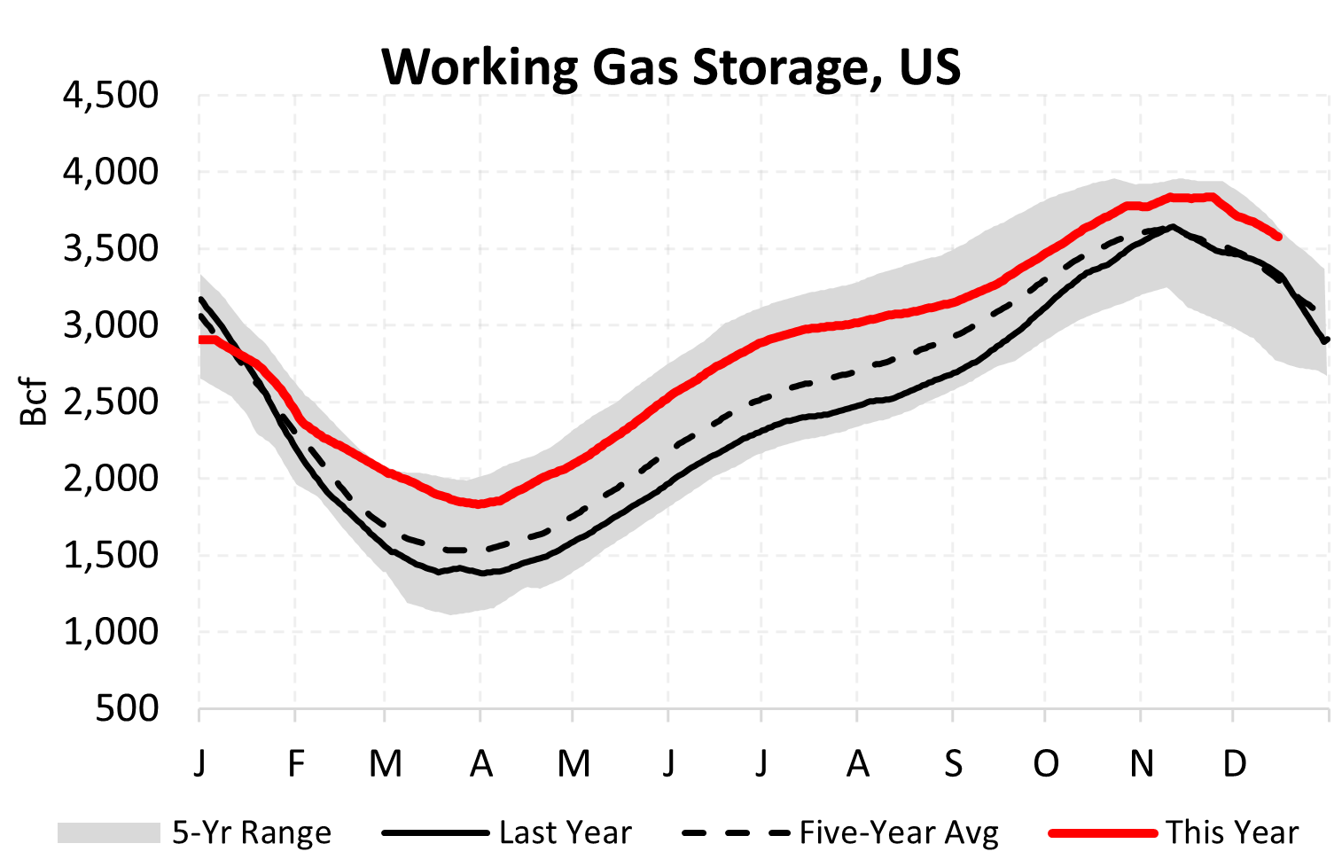 EIA reported a draw of -87 Bcf for the week ending 12/15/2023. Today's stat fell within the expected range, which was -73 Bcf on the more bearish end, and -96 Bcf on the more bullish end. This was larger than the median estimate of -82 Bcf.