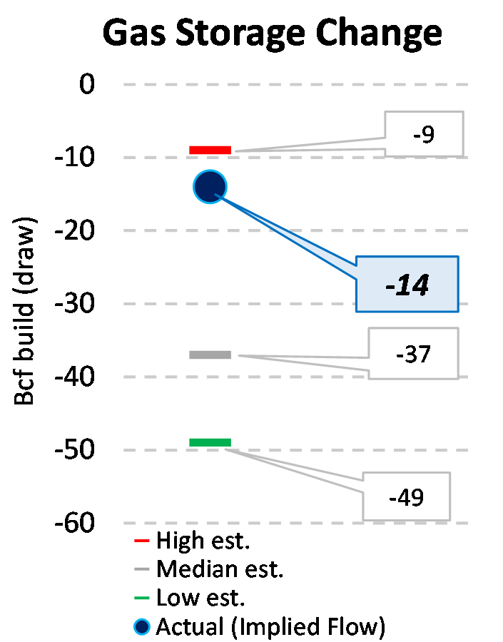 EIA reported a draw of -14 Bcf for the week ending 12/29/2023. This was smaller than the median estimate of -37 Bcf. Today's stat fell within the expected range, which was -9 Bcf on the more bearish end, and -49 Bcf on the more bullish end.