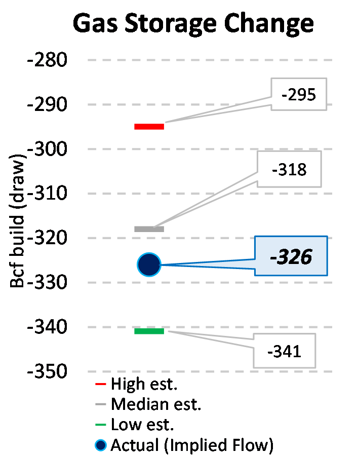 EIA reported a draw of -326 Bcf for the week ending 1/19/2024. This was larger than the median estimate of -318 Bcf. Today's stat fell within the expected range, which was -295 Bcf on the more bearish end, and -341 Bcf on the more bullish end.