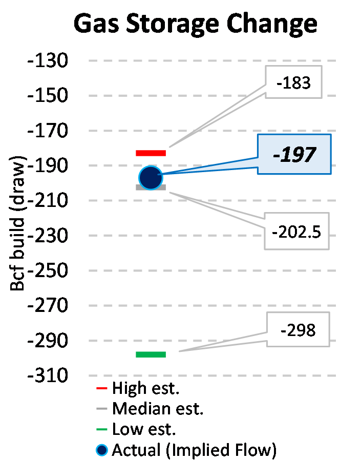 EIA reported a draw of -197 Bcf for the week ending 1/26/2024. This was smaller than the median estimate of -202.5 Bcf. Today's stat fell within the expected range, which was -183 Bcf on the more bearish end, and -298 Bcf on the more bullish end.