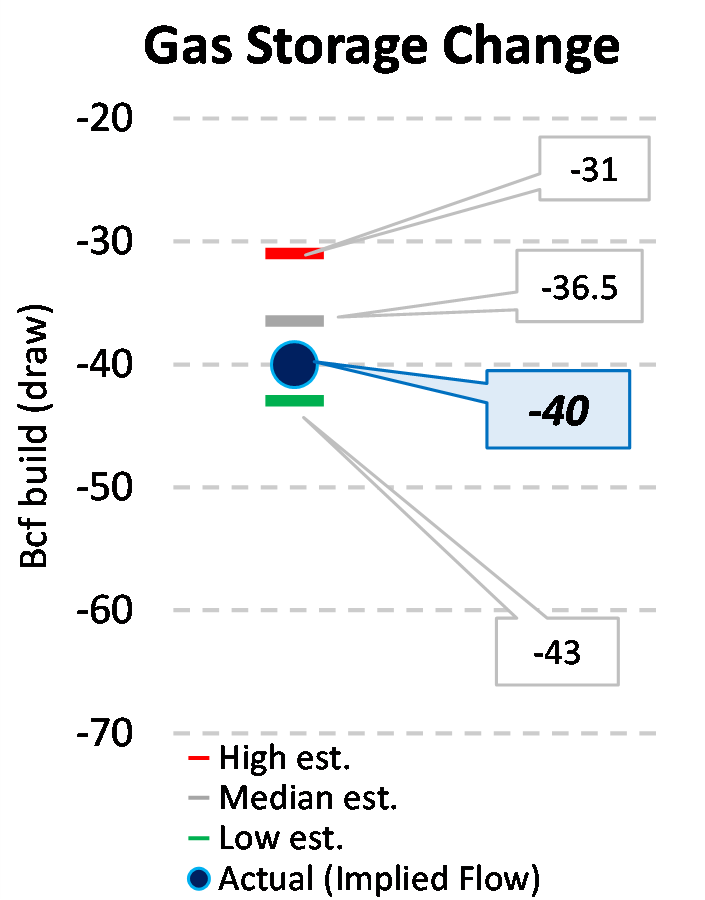 EIA reported a draw of -40 Bcf for the week ending 3/01/2024. This was larger than the median estimate of -36.5 Bcf. Today's stat fell within the expected range, which was -31 Bcf on the more bearish end, and -43 Bcf on the more bullish end.