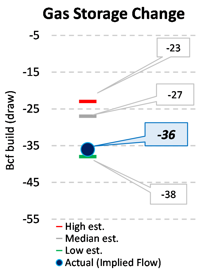 EIA reported a draw of -36 Bcf for the week ending 3/22/2024. This was larger than the median estimate of -27 Bcf. Today's stat fell within the expected range, which was -23 Bcf on the more bearish end, and -38 Bcf on the more bullish end.