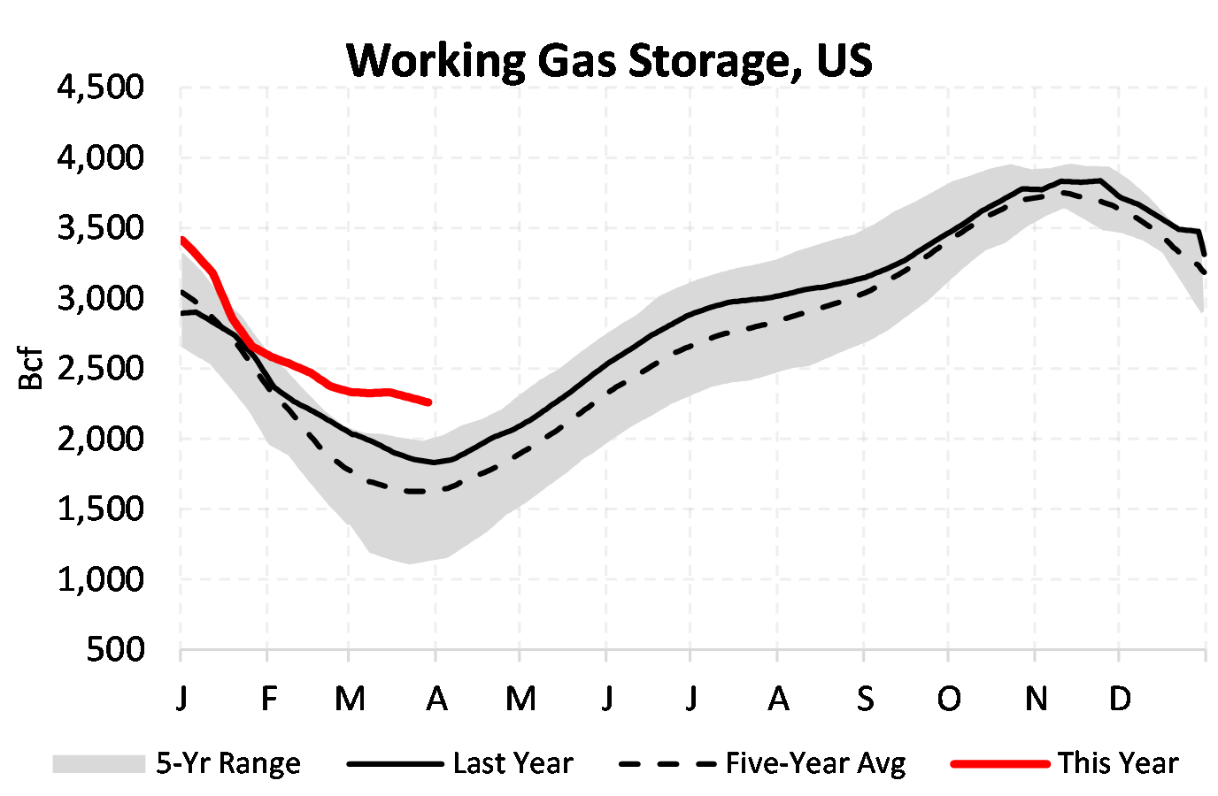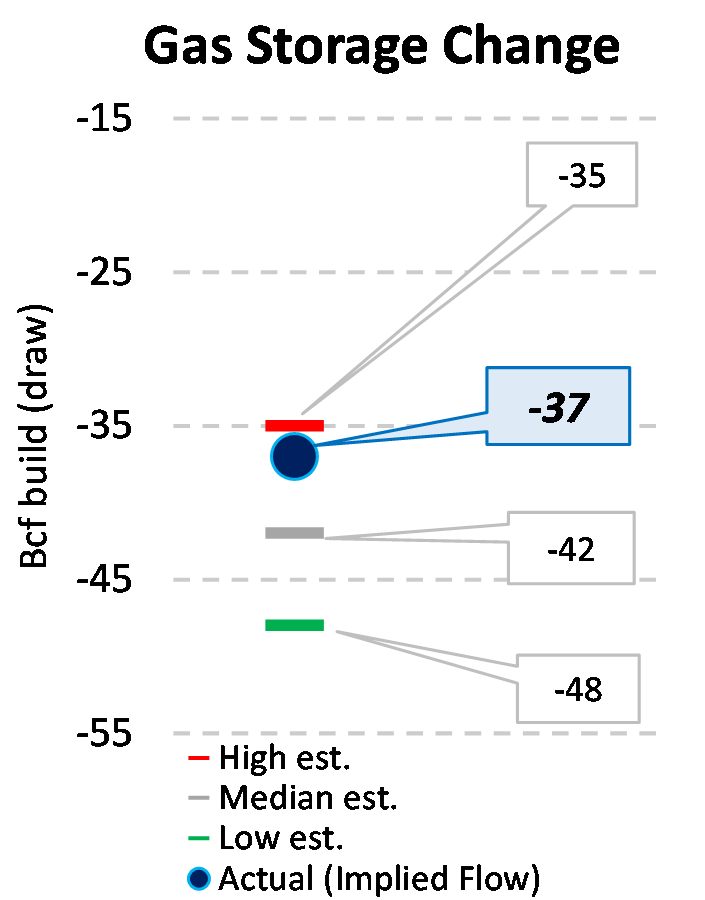EIA reported a draw of -37 Bcf for the week ending 3/29/2024. This was smaller than the median estimate of -42 Bcf. Today's stat fell within the expected range, which was -35 Bcf on the more bearish end, and -48 Bcf on the more bullish end.