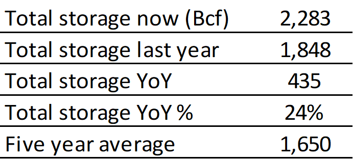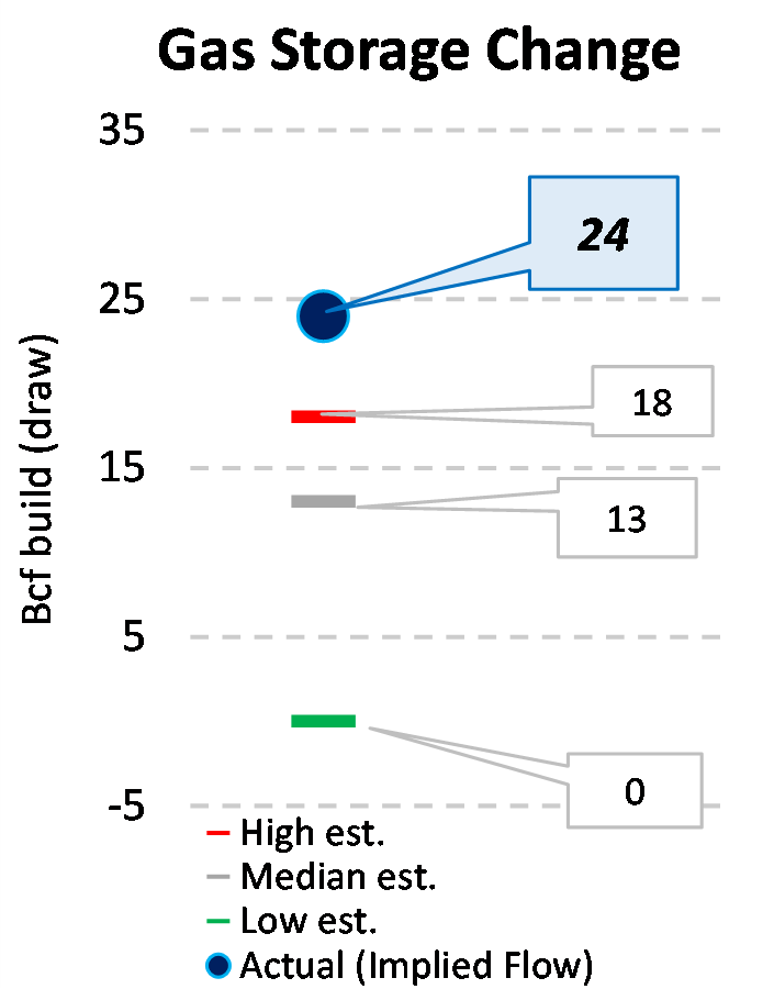 EIA reported a build of 24 Bcf for the week ending 4/05/2024. This was larger than the median estimate of 13 Bcf. Today's stat fell outside the expected range, which was 18 Bcf on the more bearish end, and 0 Bcf on the more bullish end.
