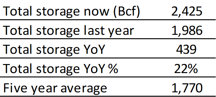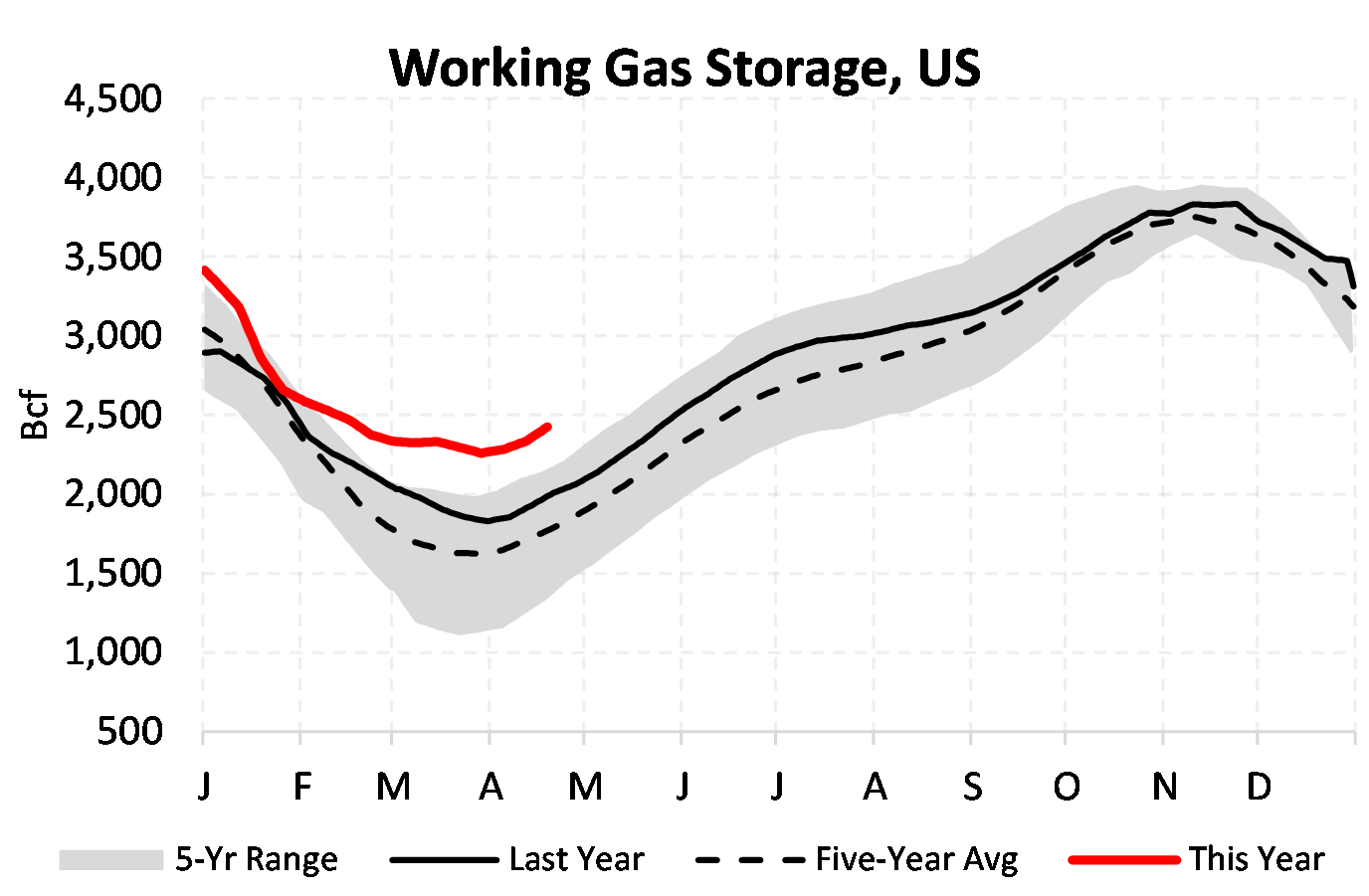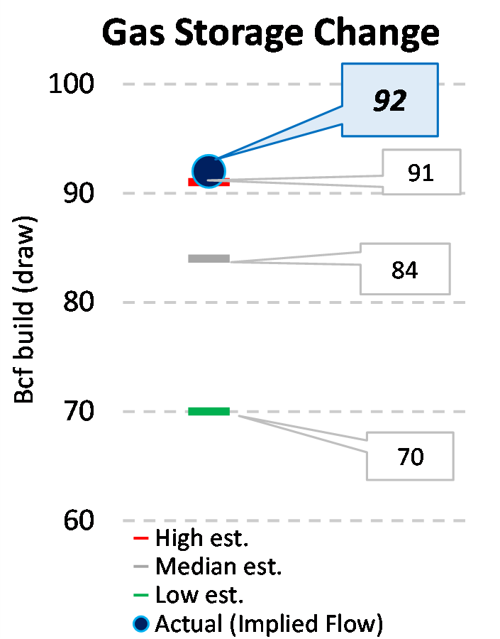 EIA reported a build of 92 Bcf for the week ending 4/19/2024. This was larger than the median estimate of 84 Bcf. Today's stat fell outside the expected range, which was 91 Bcf on the more bearish end, and 70 Bcf on the more bullish end.