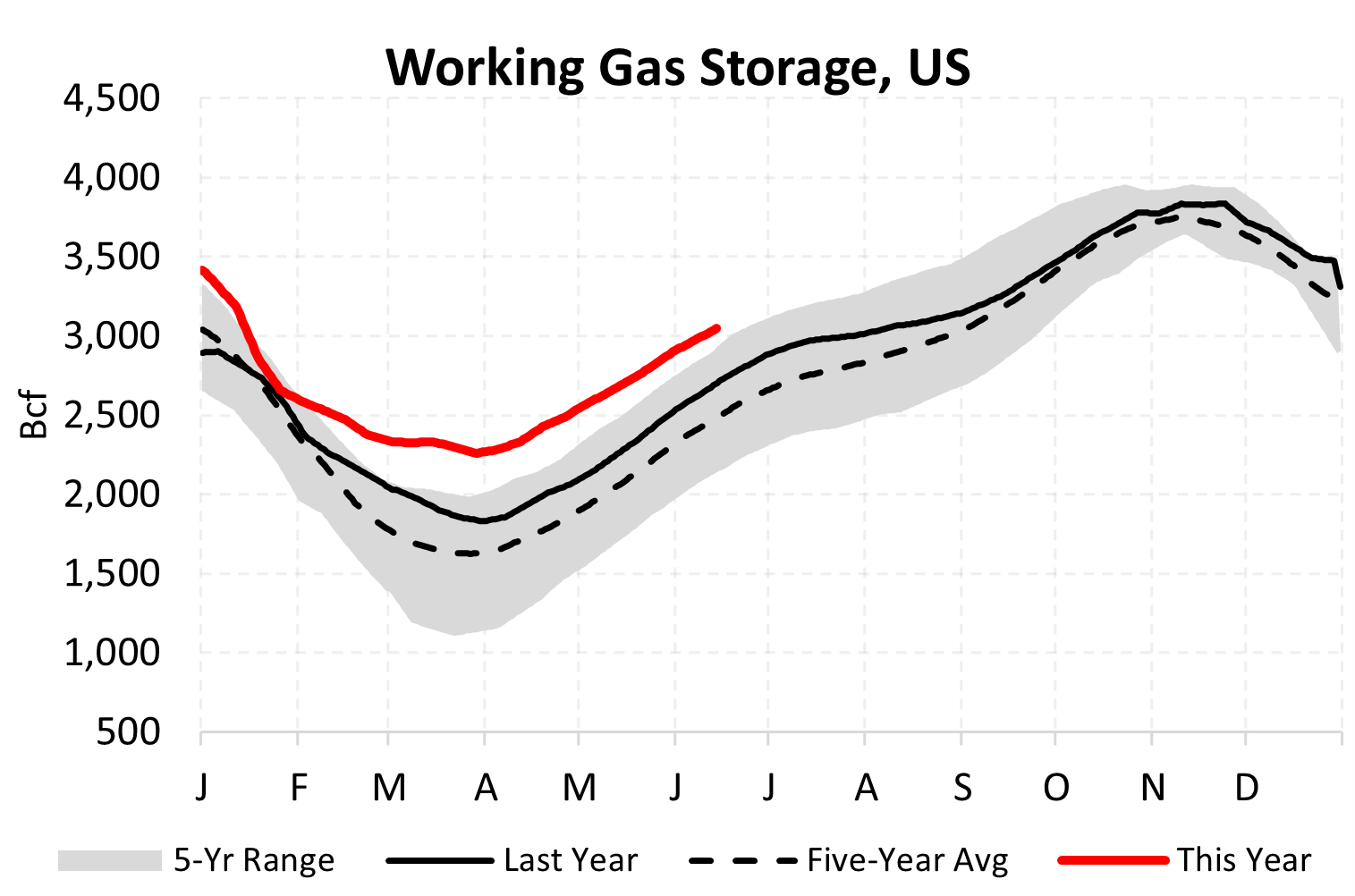 Inventories for the US are now at a surplus of 343 Bcf to last year and a surplus of 561 Bcf to the five-year average.