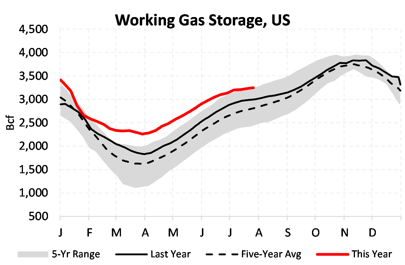 EIA reported a build of 18 Bcf for the week ending 7/26/2024. This was smaller than the median estimate of 30.5 Bcf. Today's stat fell outside the expected range, which was 41 Bcf on the more bearish end, and 22 Bcf on the more bullish end.