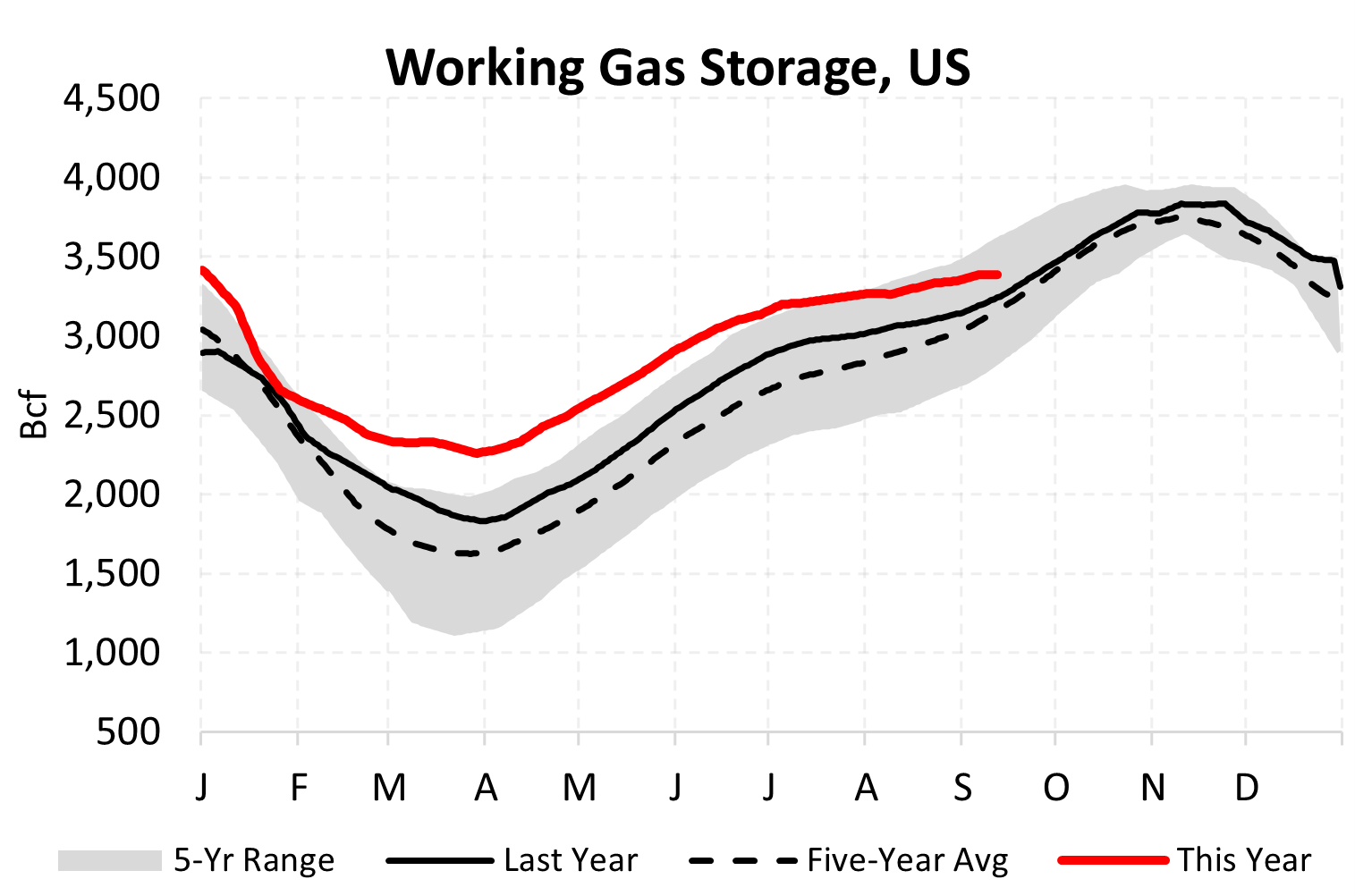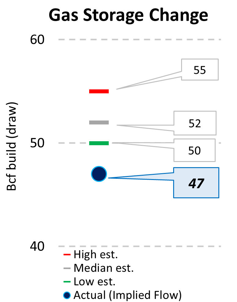 EIA reported a build of 47 Bcf for the week ending 9/20/2024. Today's stat fell outside the expected range, which was 55 Bcf on the more bearish end, and 50 Bcf on the more bullish end. This was smaller than the median estimate of 52 Bcf.