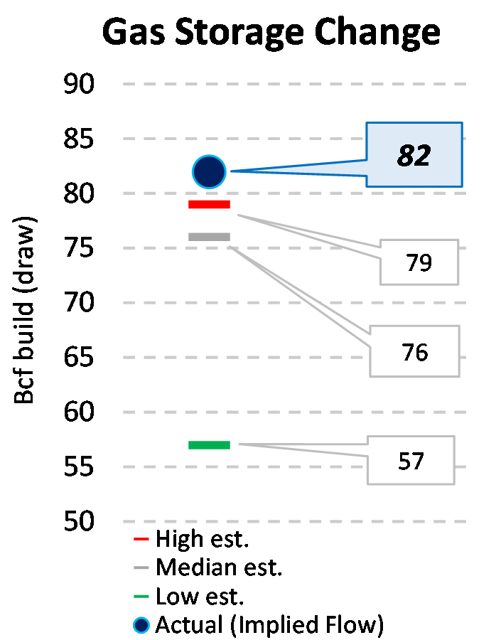 EIA reported a build of 82 Bcf for the week ending 10/04/2024. This was larger than the median estimate of 76 Bcf. Today's stat fell outside the expected range, which was 79 Bcf on the more bearish end, and 57 Bcf on the more bullish end.