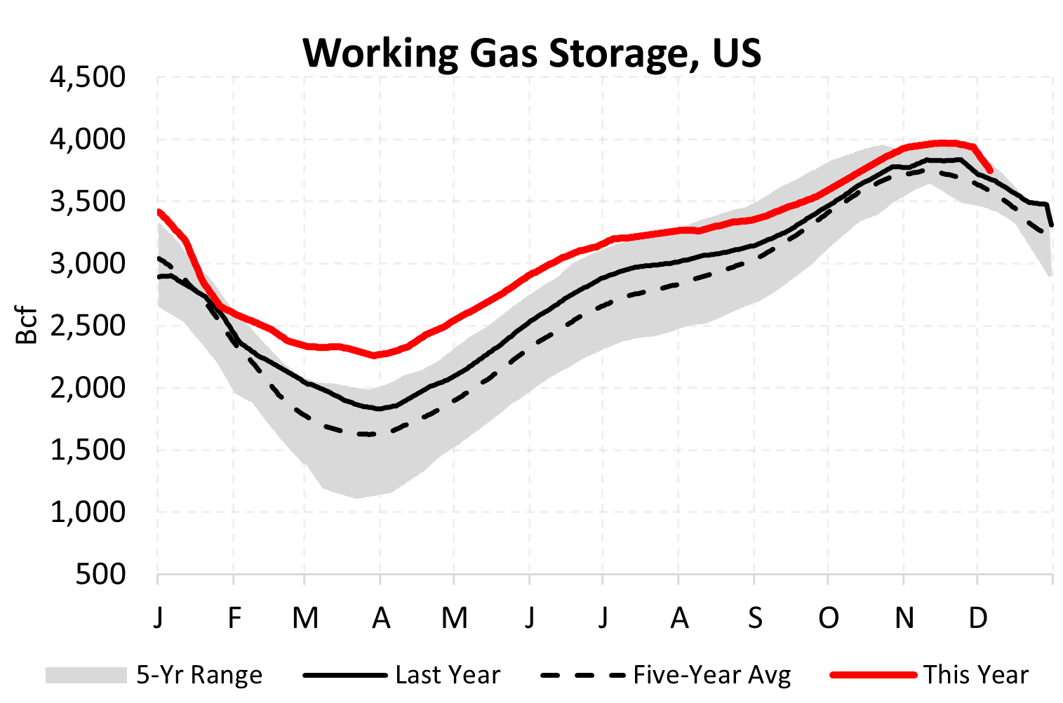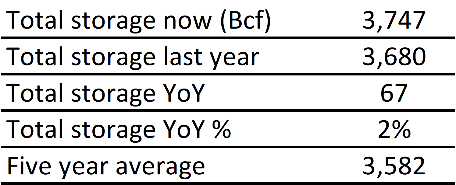 Inventories for the US are now at a surplus of 67 Bcf to last year and a surplus of 165 Bcf to the five-year average.