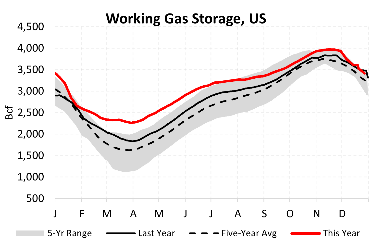 EIA reported a draw of -116 Bcf for the week ending 12/27/2024. This was smaller than the median estimate of -128 Bcf. Today's stat fell within the expected range, which was -95 Bcf on the more bearish end, and -151 Bcf on the more bullish end.
