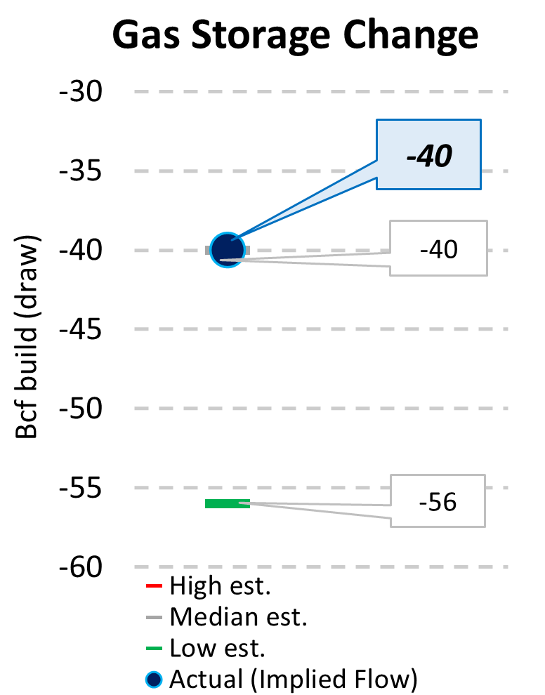 EIA reported a draw of -40 Bcf for the week ending 1/03/2025. This was equal to the median estimate of -40 Bcf. Today's stat fell within the expected range, which was -26 Bcf on the more bearish end, and -56 Bcf on the more bullish end.