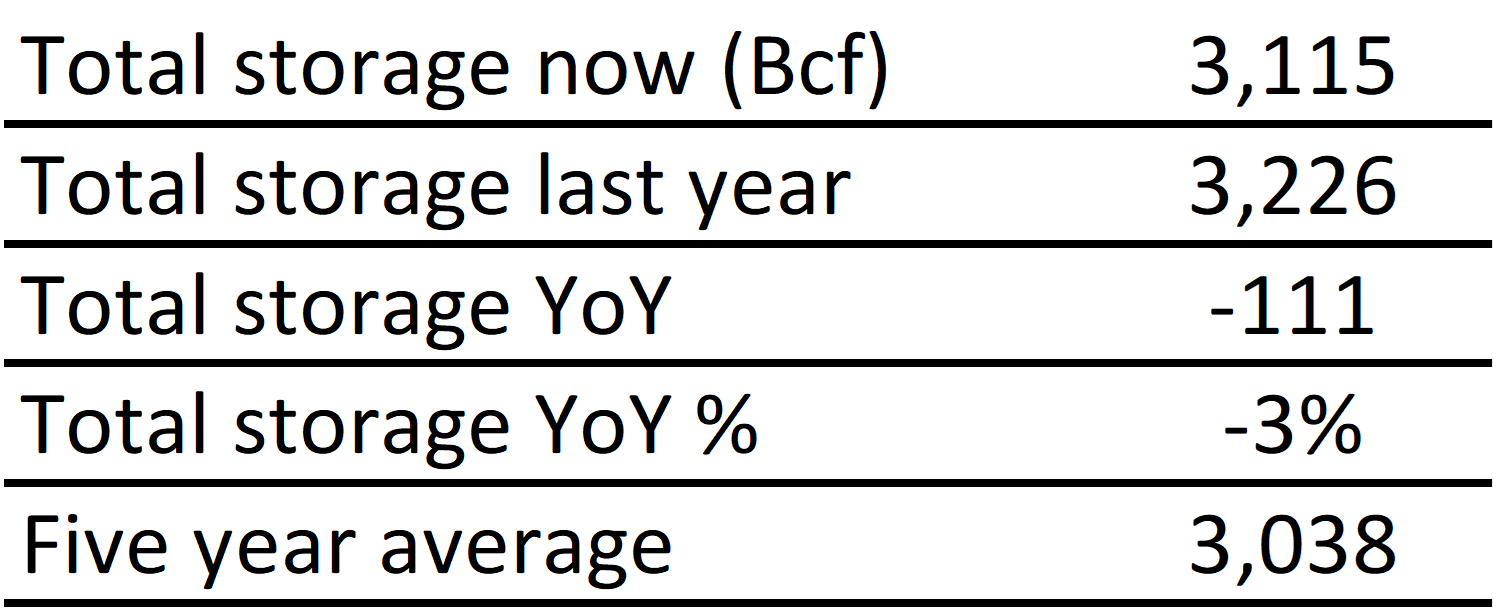 Inventories for the US are now at a deficit of 111 Bcf to last year and a surplus of 77 Bcf to the five-year average.