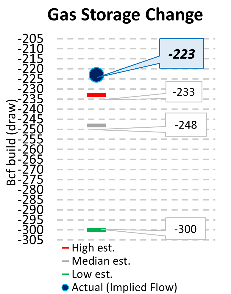 EIA reported a draw of -223 Bcf for the week ending 1/17/2025. This was smaller than the median estimate of -248 Bcf. Today's stat fell outside the expected range, which was -233 Bcf on the more bearish end, and -300 Bcf on the more bullish end.
