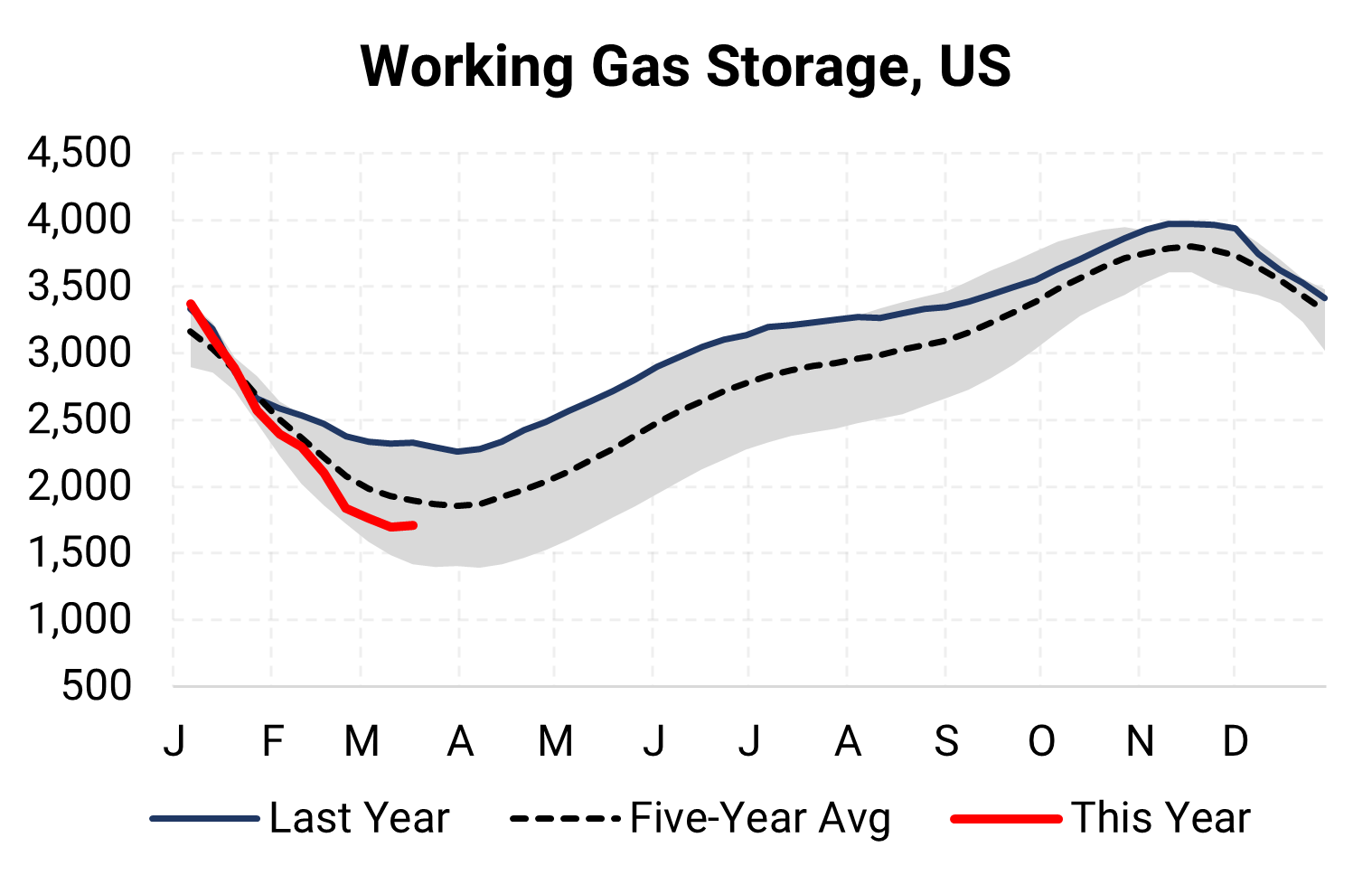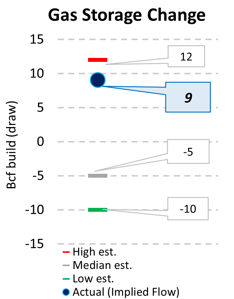 EIA reported a build of 9 Bcf for the week ending 3/14/2025. This was larger than the median estimate of -5 Bcf. Today's stat fell within the expected range, which was 12 Bcf on the more bearish end, and -10 Bcf on the more bullish end.