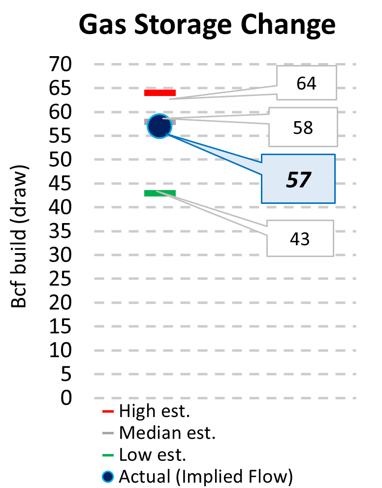 EIA reported a build of 58 Bcf for the week ending 4/04/2025. This was smaller than the median estimate of 58 Bcf. Today's stat fell outside the expected range, which was 64 Bcf on the more bearish end, and 43 Bcf on the more bullish end.