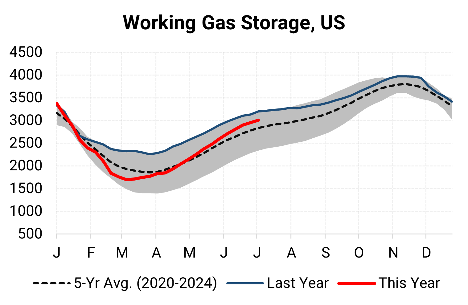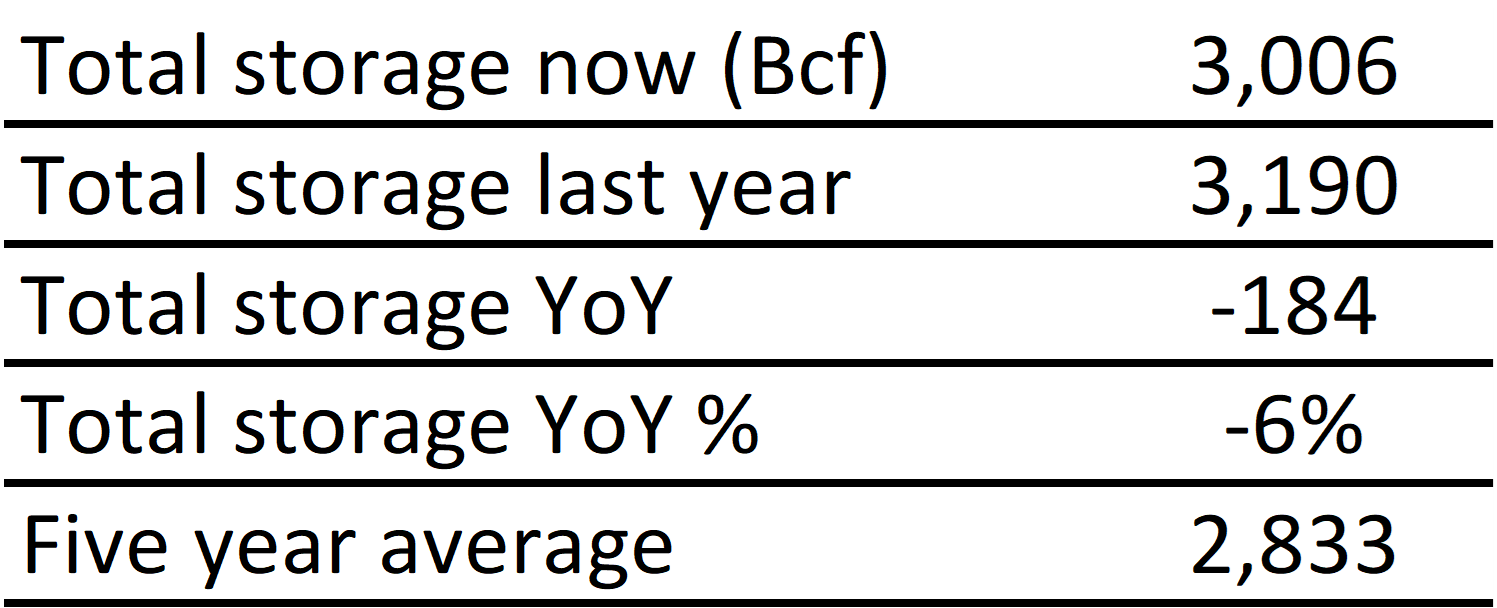 Inventories for the US are now at a deficit of 184 Bcf to last year and a surplus of 173 Bcf to the five-year average. |
