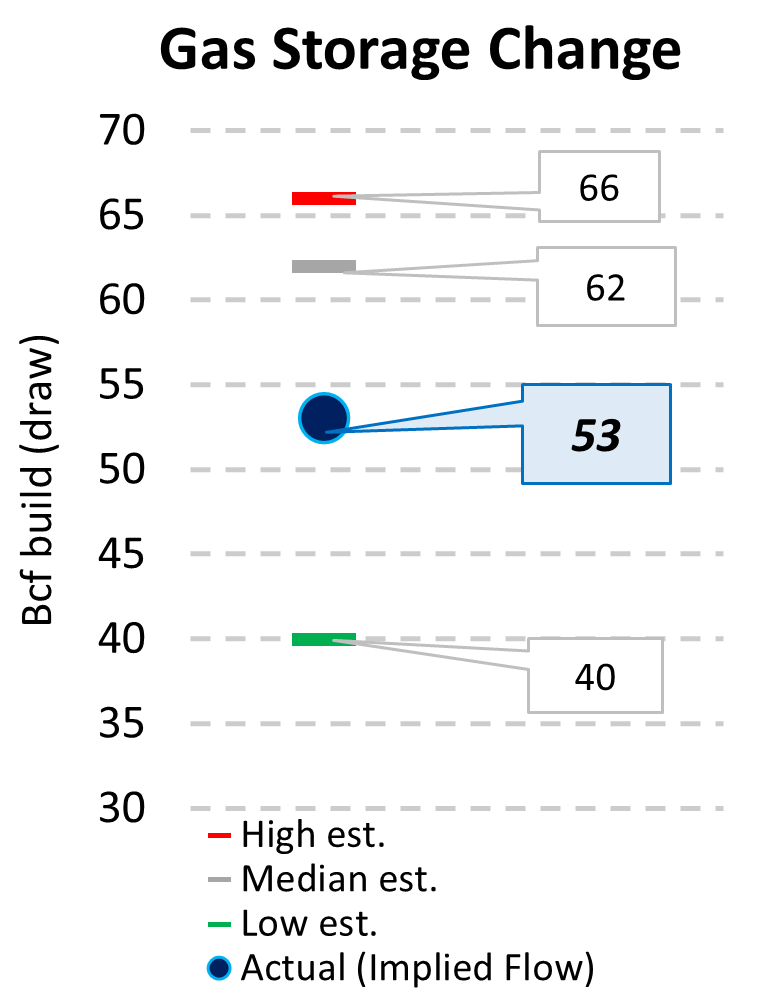 EIA reported a build of 53 Bcf for the week ending 7/4/2025. This was smaller than the median estimate of 62 Bcf. Today's stat fell within the expected range, which was 66 Bcf on the more bearish end, and 40 Bcf on the more bullish end.