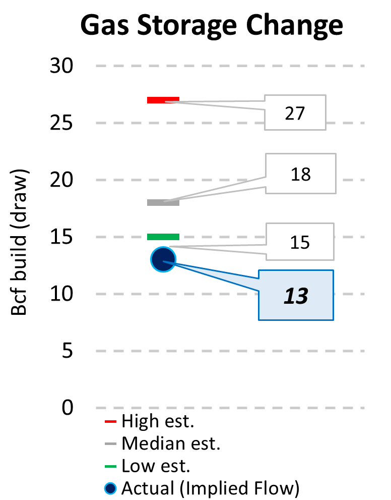 EIA reported a build of 13 Bcf for the week ending 8/21/2025. This was smaller than the median estimate of 18 Bcf. Today's stat fell outside the expected range, which was 27 Bcf on the more bearish end, and 15 Bcf on the more bullish end.