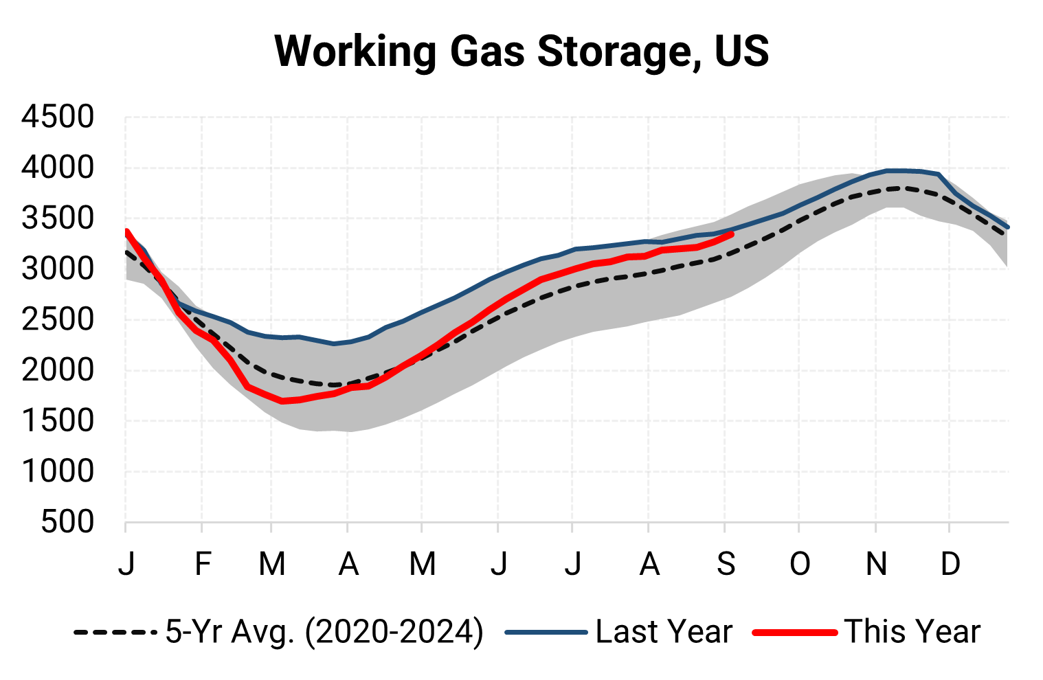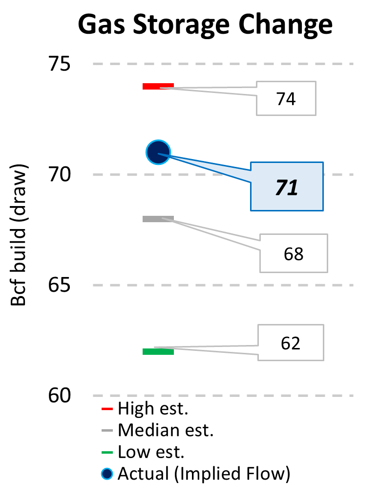 EIA reported a build of 71 Bcf for the week ending 9/05/2025. This was larger than the median estimate of 68 Bcf. Today's stat fell within the expected range, which was 74 Bcf on the more bearish end, and 62 Bcf on the more bullish end.