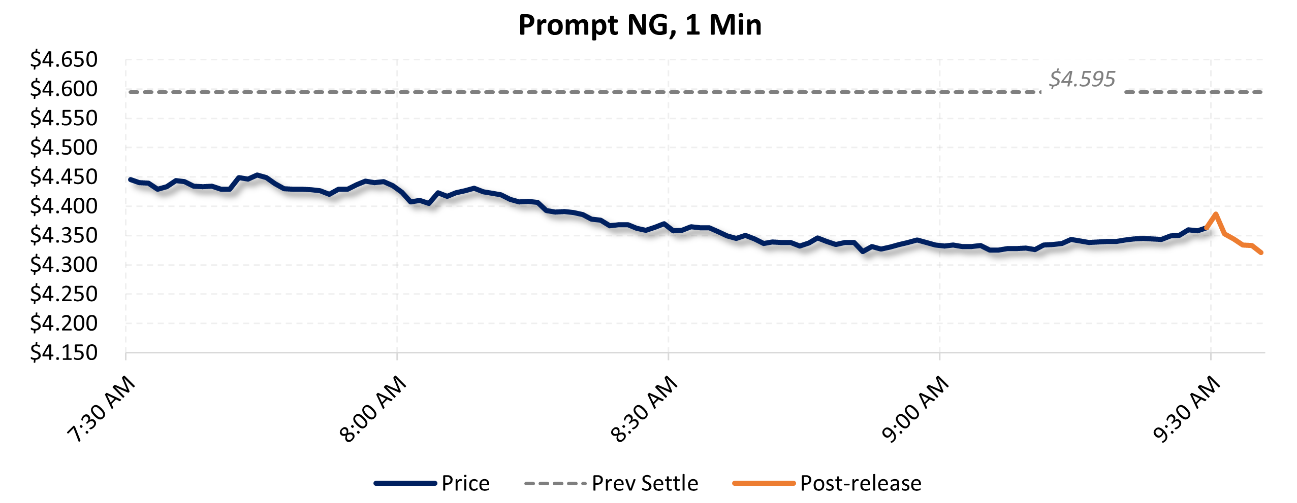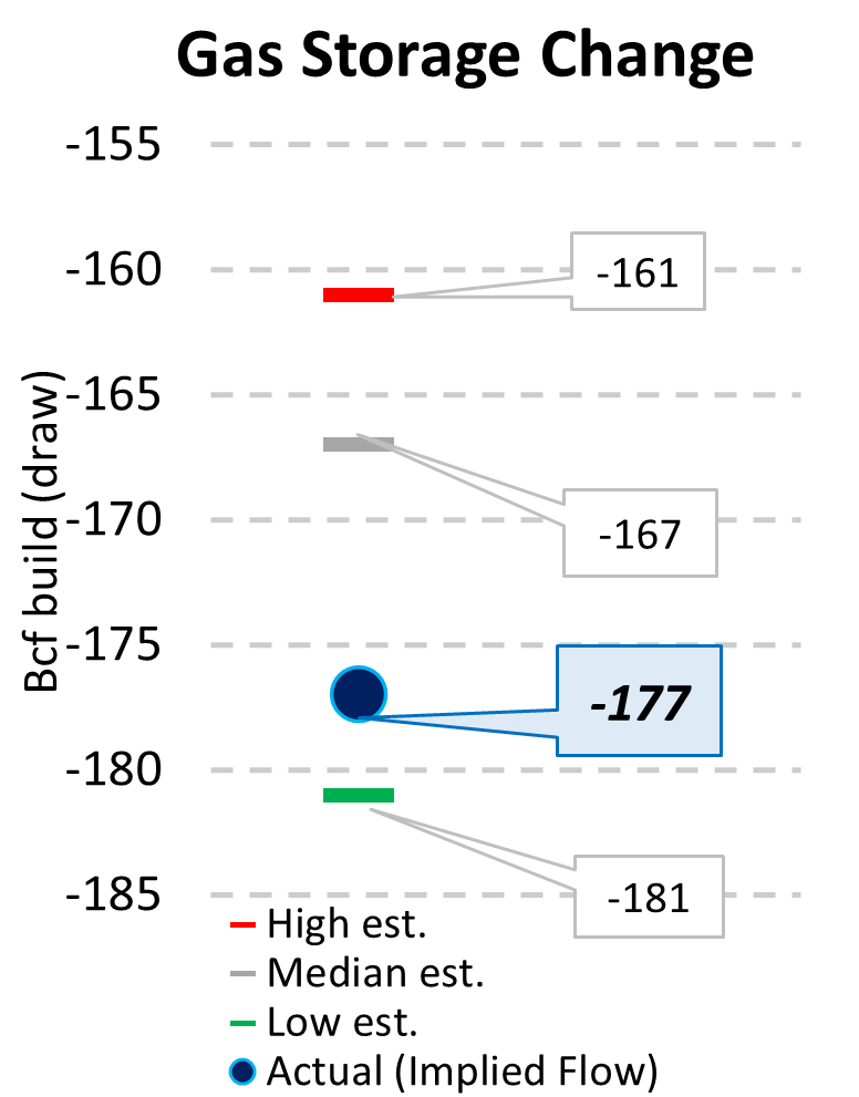 EIA reported a draw of -177 Bcf for the week ending 12/05/2025. This was larger than the median estimate of -167 Bcf. Today's stat fell within the expected range, which was -161 Bcf on the more bearish end, and -181 Bcf on the more bullish end.